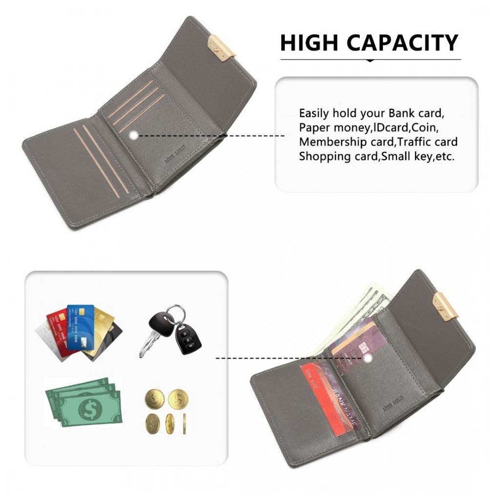 S jej rozmormi 8,5 cm (výška) x 10,5 cm (šírka) x 2,5 cm (hĺbka), je táto peňaženka ideálnym spoločníkom pre tých, ktorí uprednostňujú kompaktný štýl. Vyhotovená z hladkej PU kože v praktickej šedej farbe, jej krása sa spája s praktickým využitím.