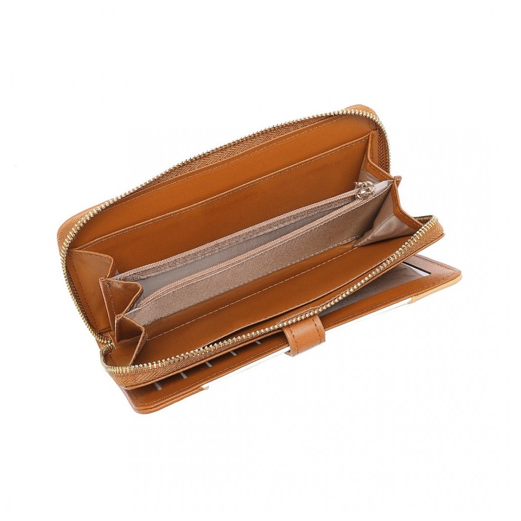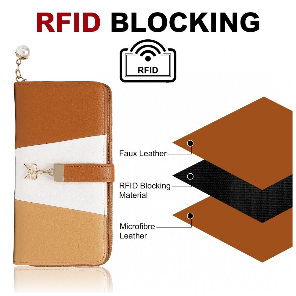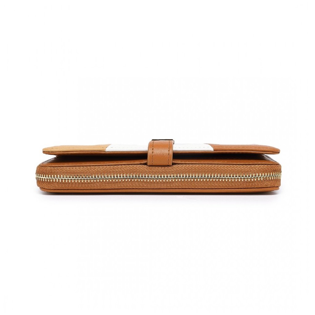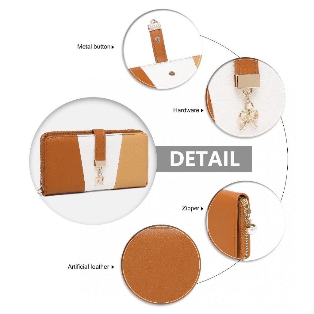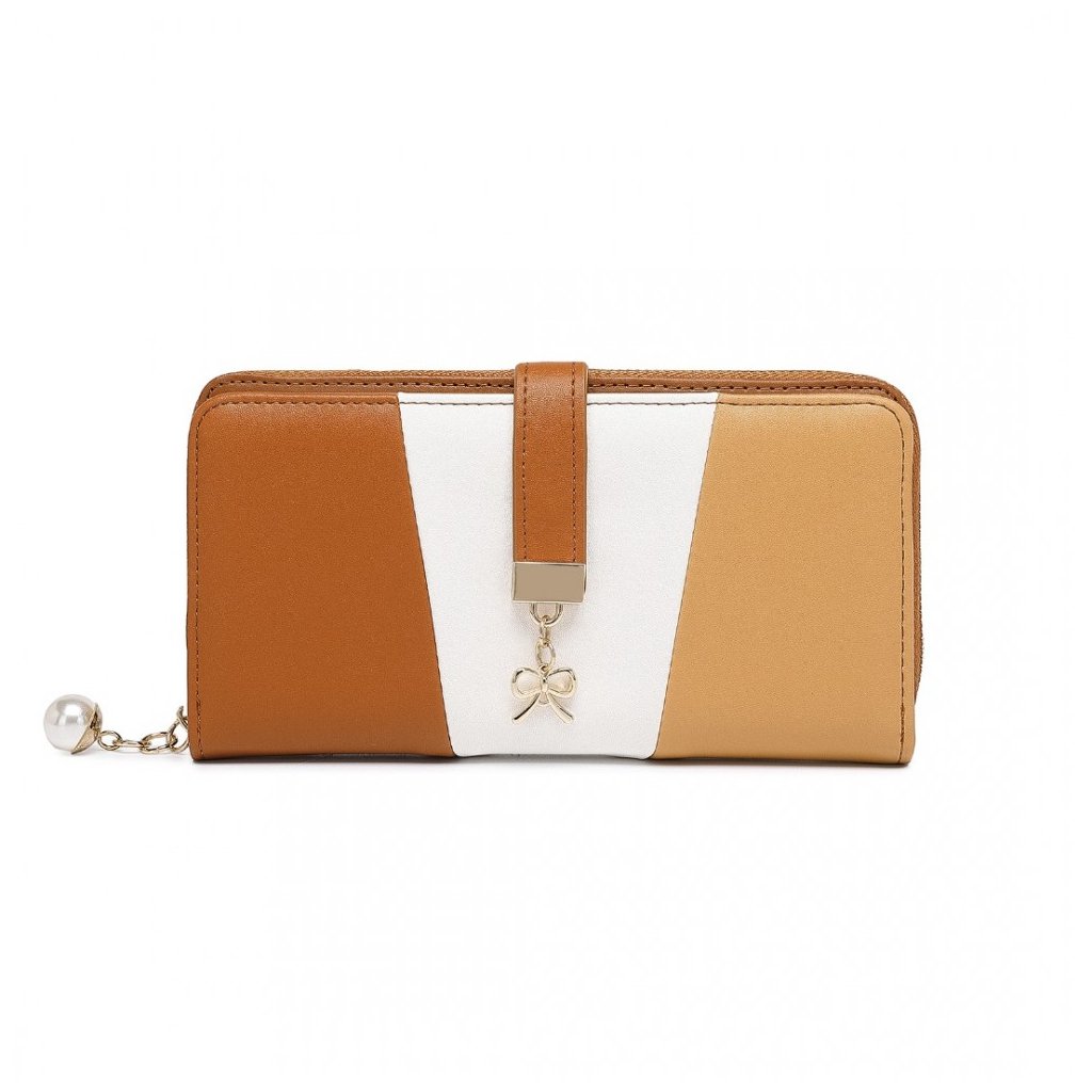Táto hnedobiela peňaženka je jedinečná kombináciou farieb. Stredná časť je biela a bočná farba je hnedej farby