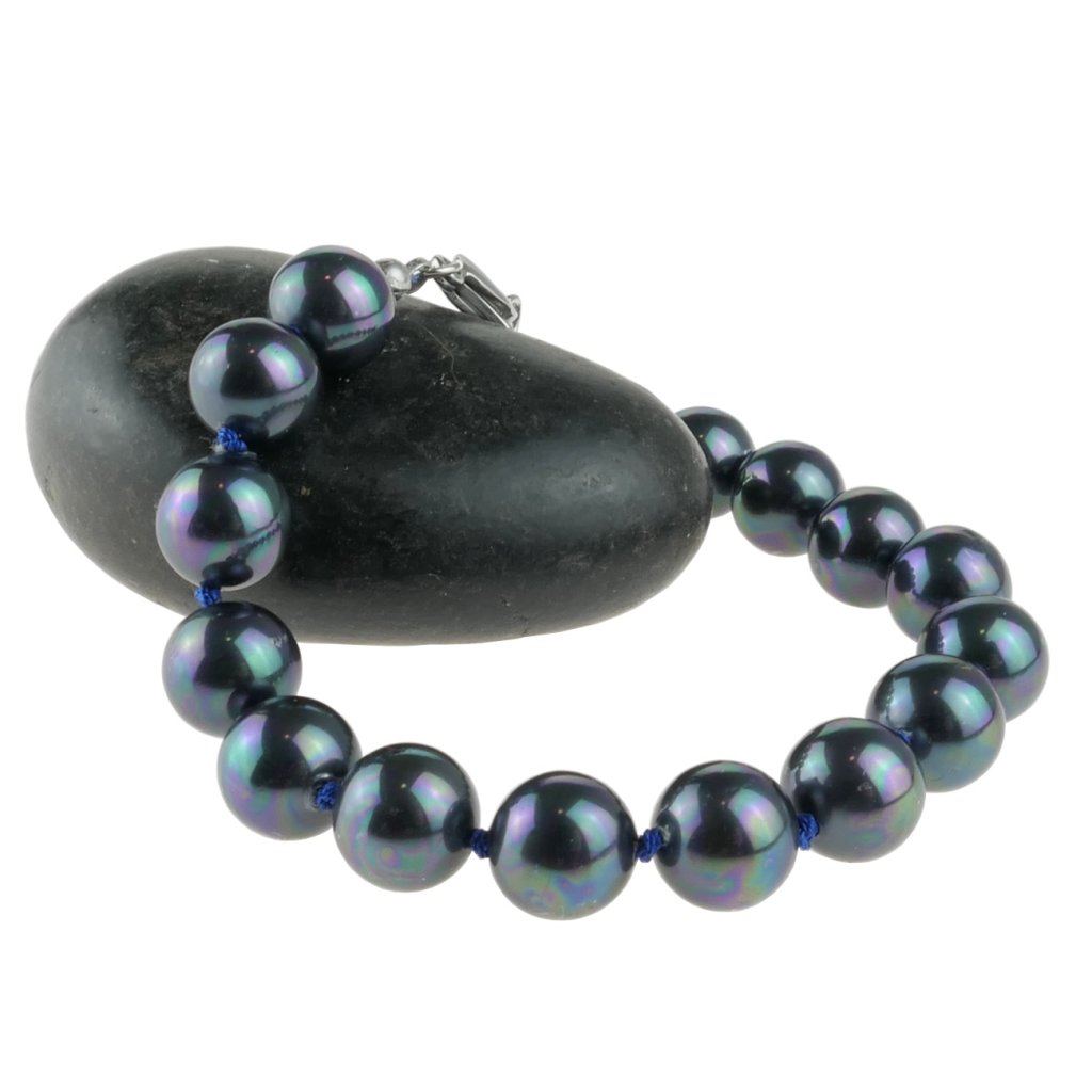 Perlový Náramok od slovenskej značky ALEXIS MARTEN ® z krásnych perál modrej farby. Celý šperk je ručne robený so shell perál metódou uzlíkovania. Perly sú navlečené na špeciálnej niti zo 100% prírodného hodvábu, odolnej voči pretrhnutiu. Priemer perál je 10 mm. klasické zapínanie na karabínku (možnosť pridať predlžovaciu retiazku )z chirurgickej ocele.