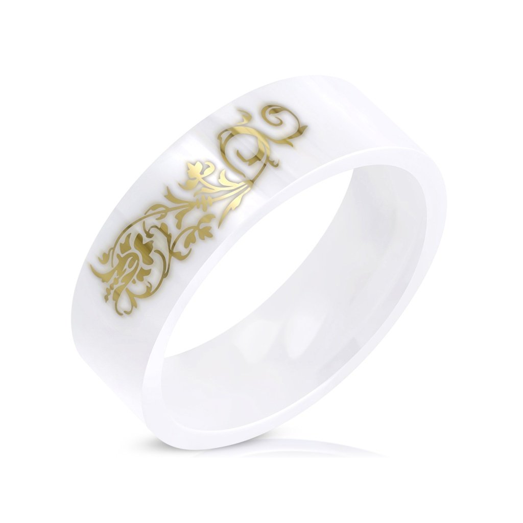 Prsteň obrúčka keramický v bielom prevedení s kvetinovým vzorom