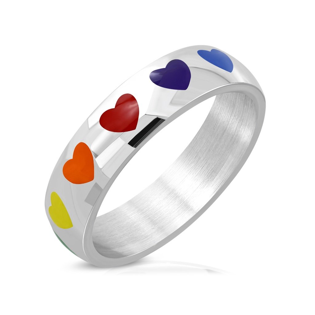 Prsteň obrúčka zdobený farbenými srdiečkami z chirurgickej ocele