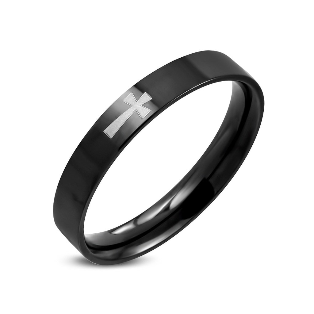 Prsteň obrúčka z ocele v čiernej farbe s krížom + darčeková krabička zadarmo