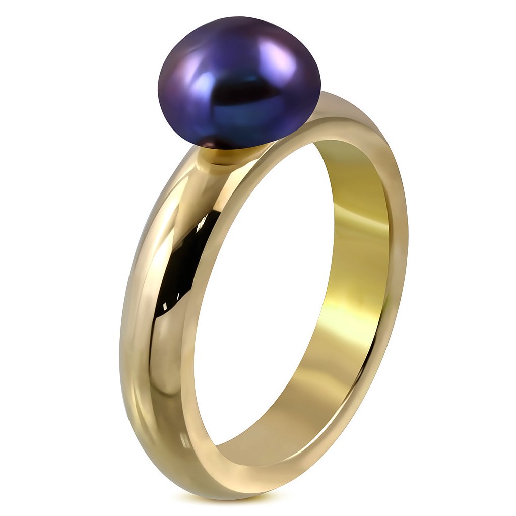 Prsteň z chirurgickej ocele zlatej farby, ktorý je doplnený pravou riečnou perlou fialovej farby. Šperky z chirurgickej ocele sú veľmi obľúbené, pretože oceľ nekoroduje ani nečerná. Prstene z chirurgickej ocele sú vhodné na bežné každodenné nosenie, pretože sú antialergické.