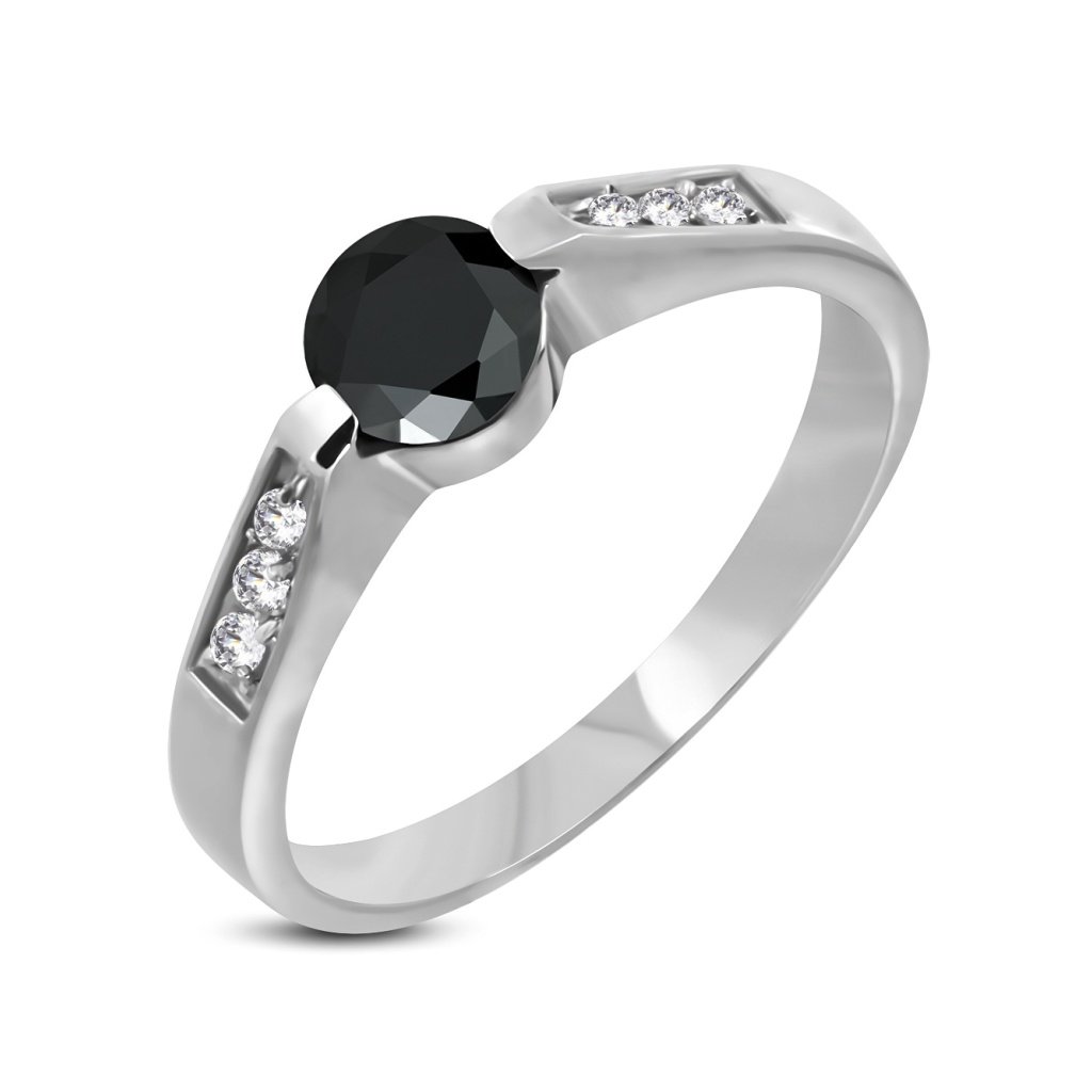 Krásny prsteň vyrobený z chirurgickej ocele. Dominantou prsteňa je čierne očko strednej veľkosti. Obvod prsteňa zdobia tri malé očká čírej farby. Prsteň je elegantný a skvelé doplní slávnostnejší outfit, no nič ním nepokazíte ani pri ležérnejšom outfite na každodenné nosenie. Materiál šperku je kvalitná chirurgická oceľ, ktorá Vám zaručí dlhú životnosť prsteňa. Šperky z chirurgickej ocele nekorodujú ani nečernajú a oceľ je antialergická, čiže je vhodná na bežné každodenné nosenie.