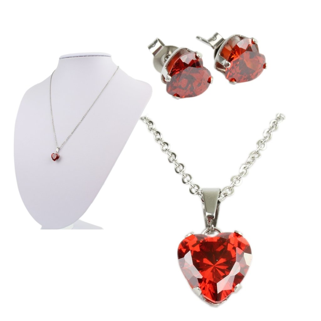 Nežná retiazka s príveskom v tvare srdiečka a napichovacie náušnice s rovnakým motívom srdiečko spolu vytvárajú neodolateľný romantický set. Srdiečka krásnej sýto červenej farby sa vďaka diamantovému výbrusu nádherne ligocú a zaručene pútajú pozornosť. Jemný, ale výrazný set z chirurgickej ocele spája nadčasovú eleganciu s modernými materiálmi. Vďaka kvalitnému vypracovaniu z hypoalergénnych materiálov si šperk natrvalo udrží svoj lesk a nebude podliehať korózii. Touto súpravou šperkov doplníte akýkoľvek outfit, nebude prekážať v práci a zvýrazní aj spoločenské oblečenie. Na rozdiel od lacnej bižutérie nestratí časom nič zo svojej noblesy. Šperk je vhodný aj ako univerzálny dar pre ženu, ku ktorej máte citový vzťah. Na veku dámy nezáleží, tento model je vhodný naozaj pre každú ženu.