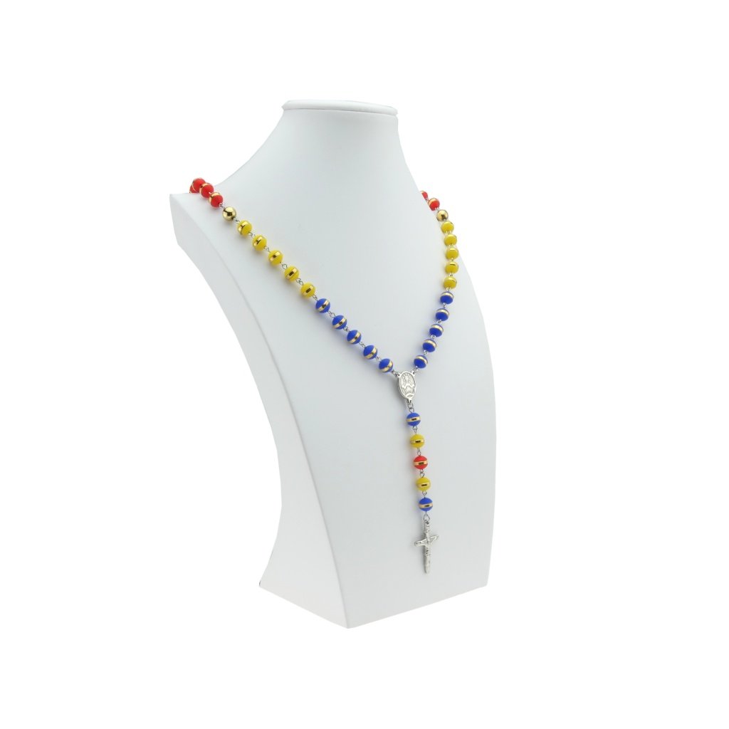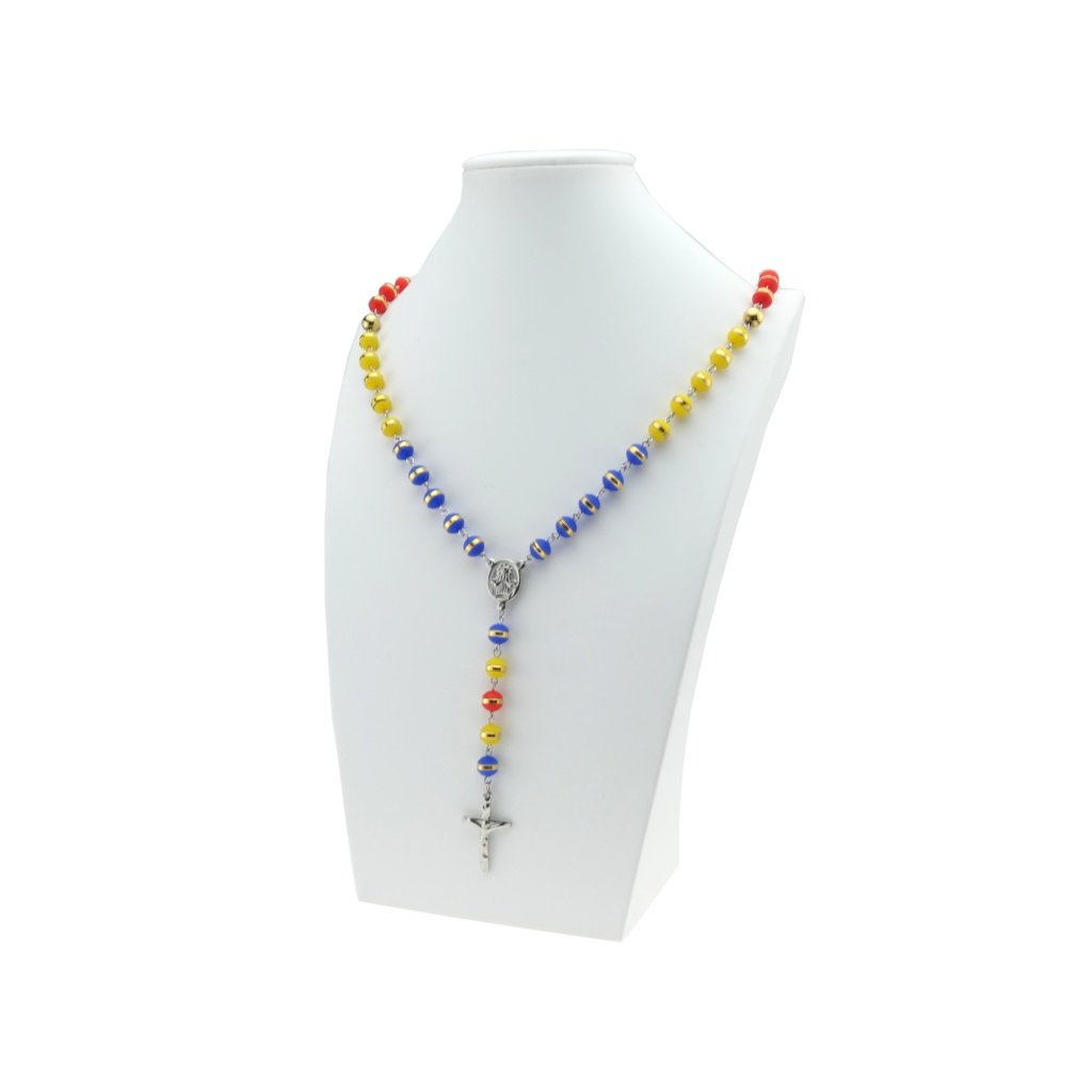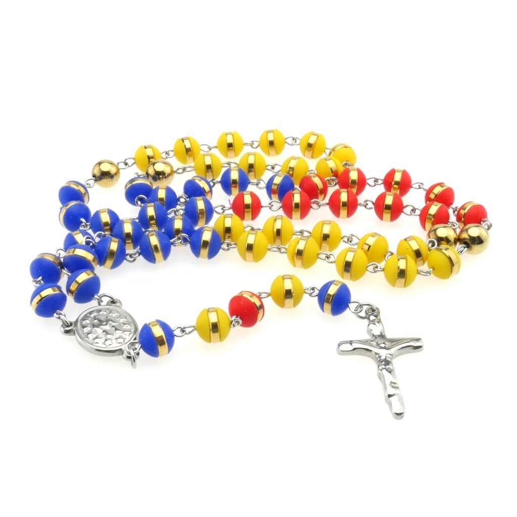 Veľmi zaujímavý farebný ruženec z chirurgickej ocele. Ruženec má gumené guličky, ktoré sú v strede zdobené kruhom v zlatej farbe z chirurgickej ocele. Pôsobí veľmi nezvyčajne vďaka trojfarebnej kombinácií modrá, červená, žltá. Medajlón Panna Mária a kríž s ukrižovaným Ježišom Kristom sú v striebornej farbe, rovnako ako očká, ktoré spájajú farebné guličky. Ruženec je veľmi často vyhľadávanou náboženskou retiazkou, ktorá má silný kresťanský charakter. Materiál ruženca je guma a chirurgická oceľ, ktorá je pevná a odolná, nekoroduje a nečerná.