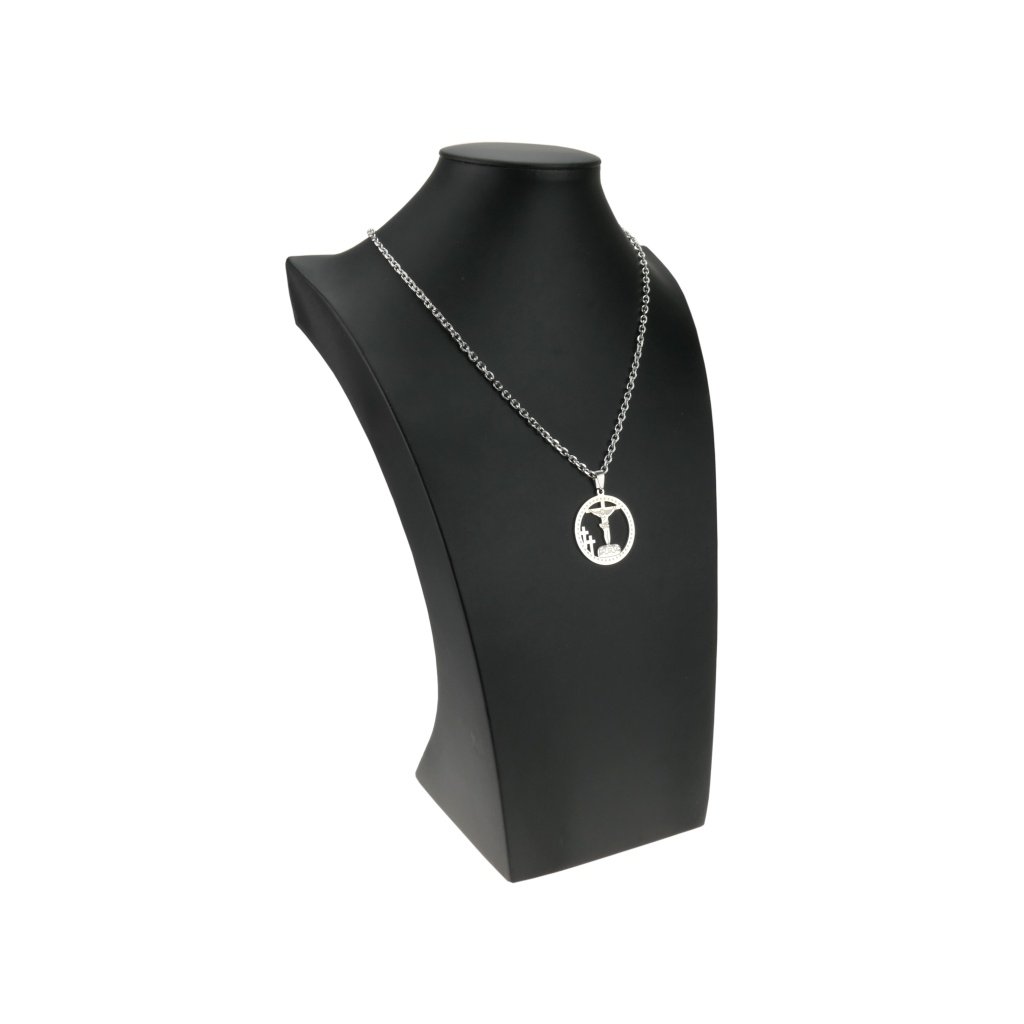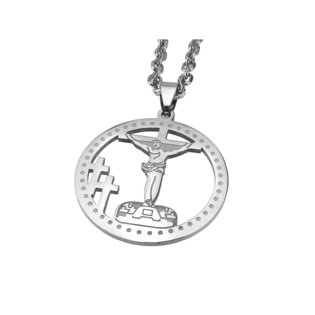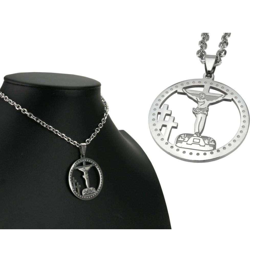 Zaujímavý unisex prívesok s retiazkou vyrobené z kvalitnej chirurgickej cele. Prívesok má okrúhly tvar, vo vnútri ktorého je zobrazený ukrižovaný Ježiš Kristus. Retiazka s príveskom má určitú náboženskú hodnotu a je vhodná aj ako darček pre blízku osobu. Celý šperk je vyrobený z kvalitnej chirurgickej ocele, ktorá je pevná a odolná, nestráca svoj lesk ani tvar. Šperky z chirurgickej ocele si nevyžadujú žiadnu špeciálnu starostlivosť a sú antialergické. Pri tomto šperku si viete zvoliť dĺžku retiazky podľa vlastnej potreby.