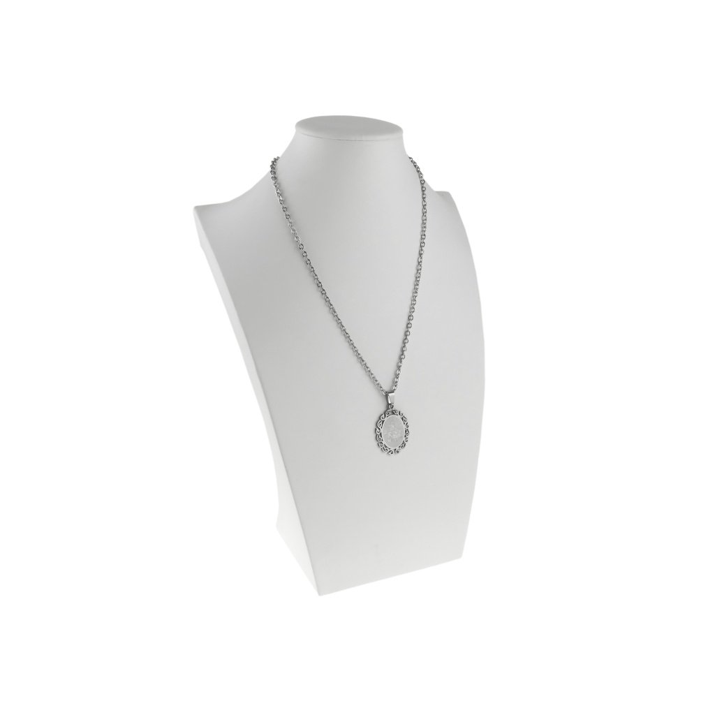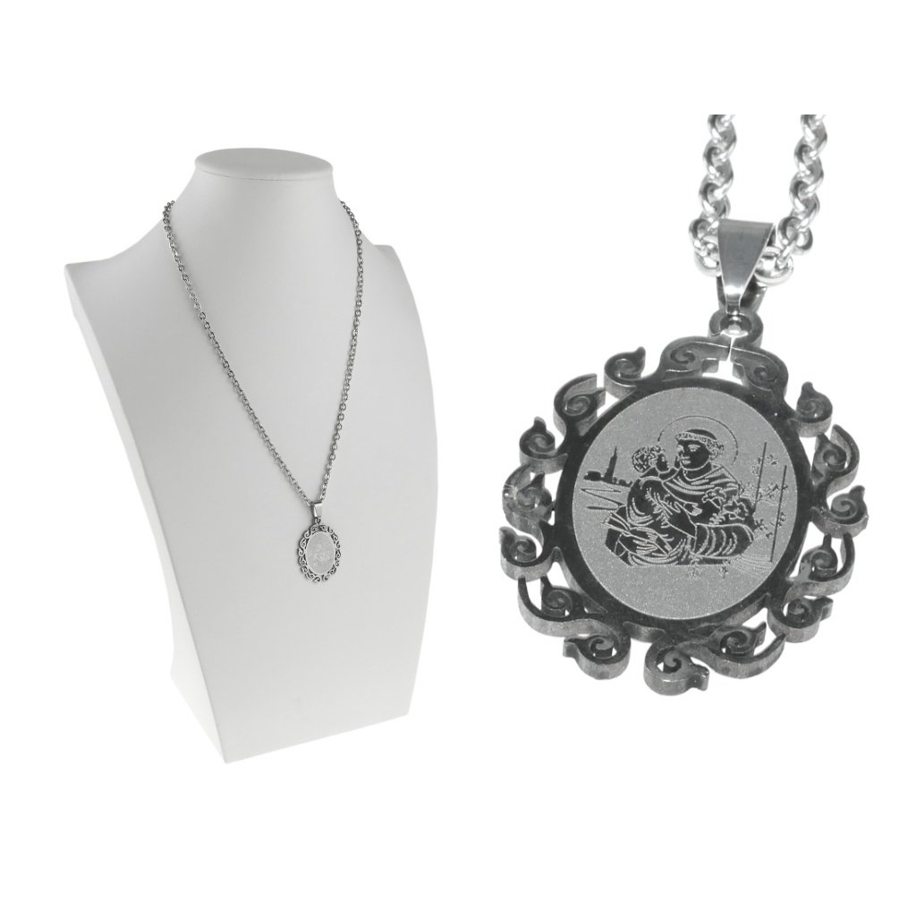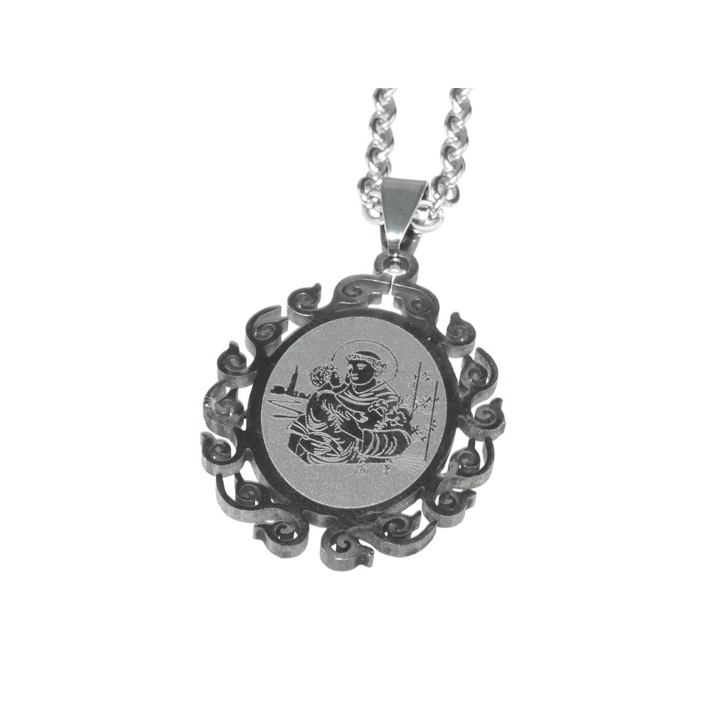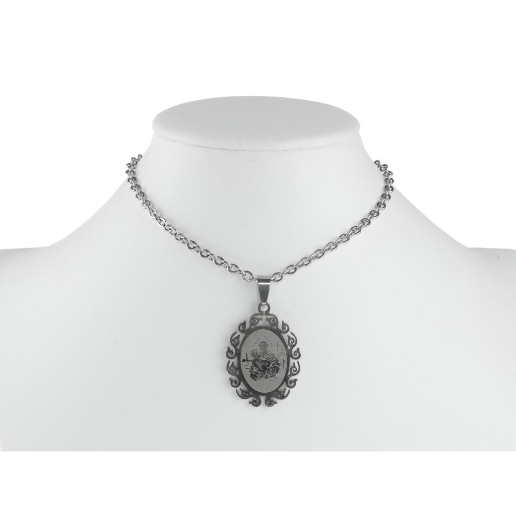 Krásna retiazka s príveskom vyrobená z kvalitnej chirurgickej ocele. Prívesok má tvar oválu, ktorý je po obvode zdobený ornamentami. V strede je zobrazený svätý Jozef s dieťaťom v náručí. Nádherný prívesok je vhodný aj ako dar na pamiatku pri cirkevným udalostiach, alebo ako ako ochranný prívesok. Materiál retiazky s príveskom je pevná a odolná chirurgická oceľ, ktorá nečerná ani nekoroduje. Šperky z chirurgickej ocele sú vhodné na každodenné nosenie, pretože sú antialergické. Pri tomto produkte máte možnosť zvoliť si dĺžku retiazky.