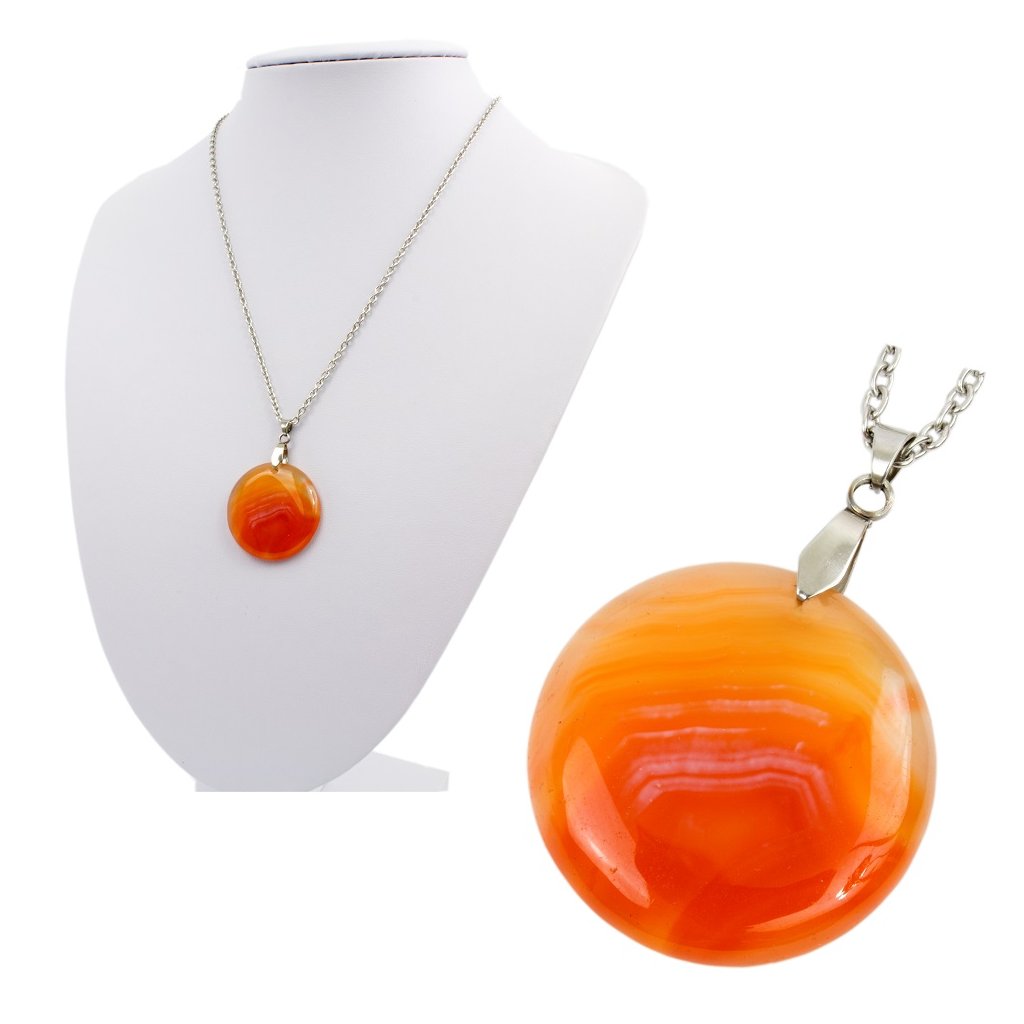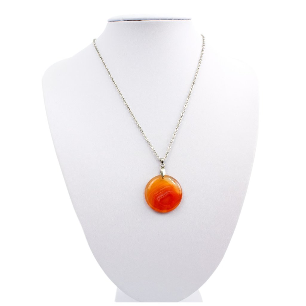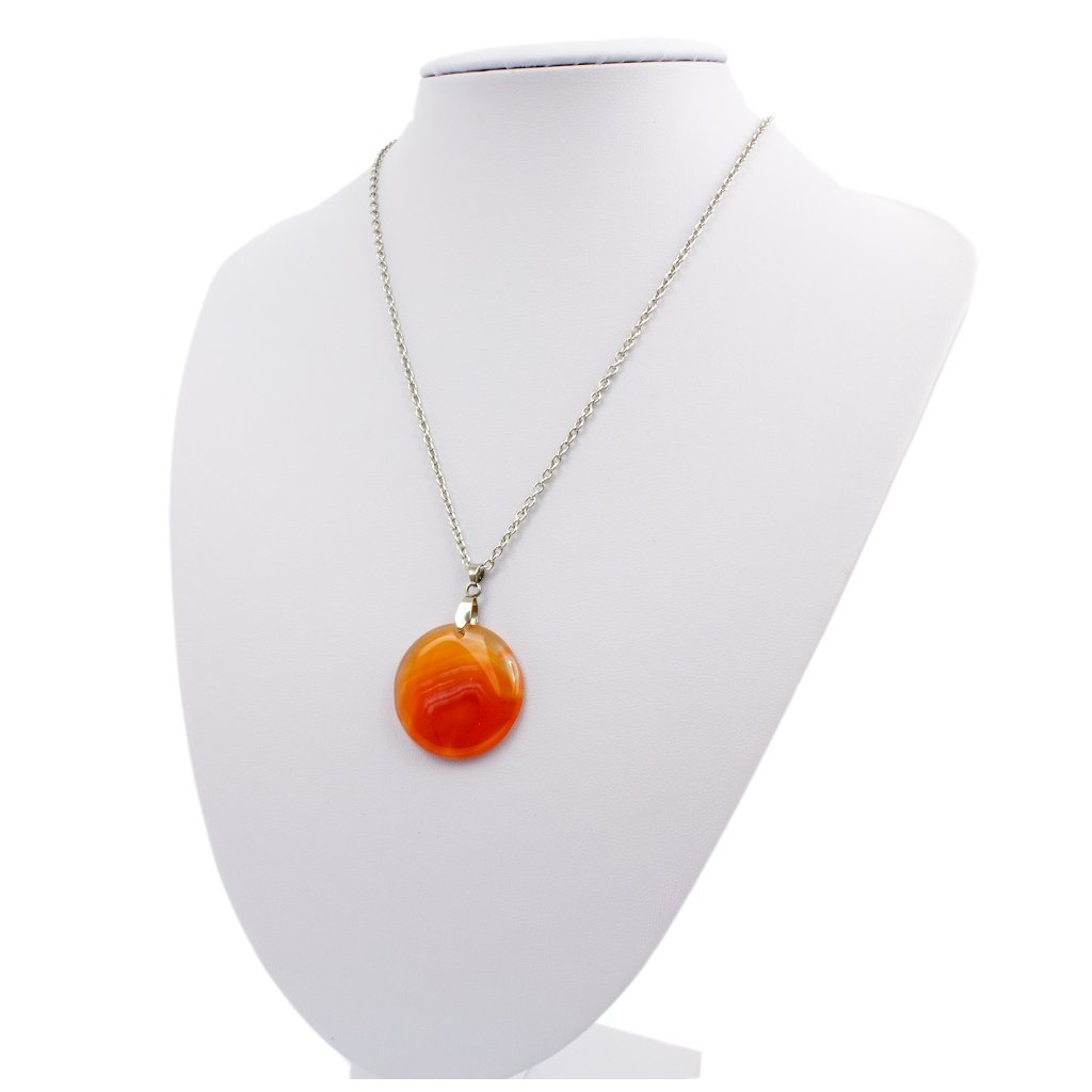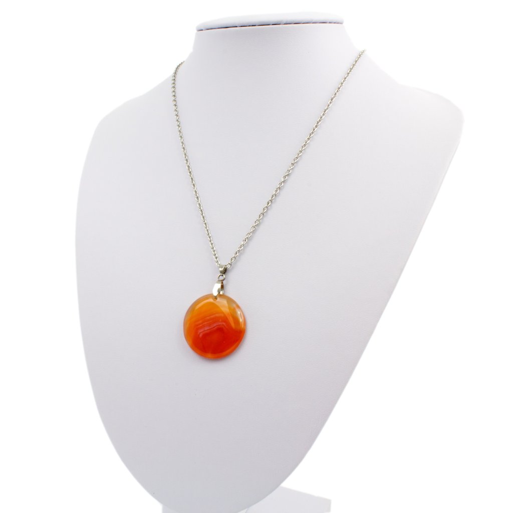 Retiazka s príveskom v tvare kruh z Achátu oranžovej farbe. Nevšedný unikátny dizajn, ktorý stvorila sama príroda. V spojení s retiazkou z chirurgickej ocele získate moderný jedinečný šperk. Vďaka svojej jedinečnej prirodzenej kresbe je každý prívesok unikátny. Pri tomto šperku si viete vybrať dĺžku retiazky ak Vám nevyhovuje jej základná dĺžka.