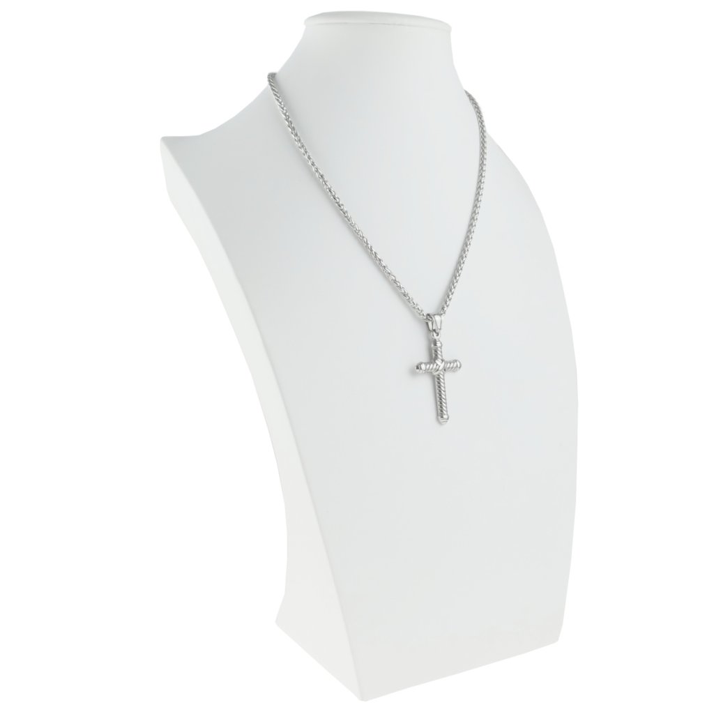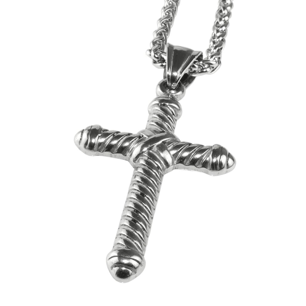 Zaujímavá pánska retiazka s príveskom kríž v striebornom prevedení. Tento šperk je vhodný pre pánov, ktorí majú radi zaujímavé nie celkom klasické šperky. Krížik je akoby omotání a pôsobí veľmi pekne. Retiazka je veľmi obľúbený pletený vzor a je možnosť ju nosiť aj samostatne bez prívesku. Celý šperk je vyrobený z kvalitnej chirurgickej ocele, ktorá je hypoalergéna a nečerná, ako to poznáme z lacnej bižutérie či striebra. Chirurgická oceľ si nevyžaduje žiadnu špeciálnu starostlivosť.