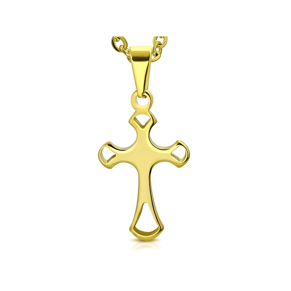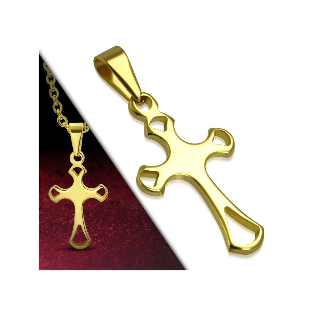 Retiazka s príveskom kríž vyrobená z chirurgickej ocele v zlatej farbe. Prívesky v tvare kríža sú veľmi populárne, keďže majú istú náboženskú hodnotu a sú vhodné aj ako darček. Prívesok kríž je menšieho tvaru a je jednoduchý, hladký s vyrezanými otvormi na každom konci. Je skôr vhodný pre ženy, ale aj pre mužov, ktorí preferujú menej výrazne šperky.Pri tomto produkte si viete sami zvoliť dĺžku retiazky. Materiál retiazky s príveskom je chirurgická oceľ, ktorá sa teší svojej obľube, pretože oceľové šperky sú pevné, odolné, nečernajú a zachovávajú si svoj tvar a lesk. Ak Vám nevyhovuje dĺžka retiazky, pri tomto šperku máte na výber dĺžku retiazky podľa seba.