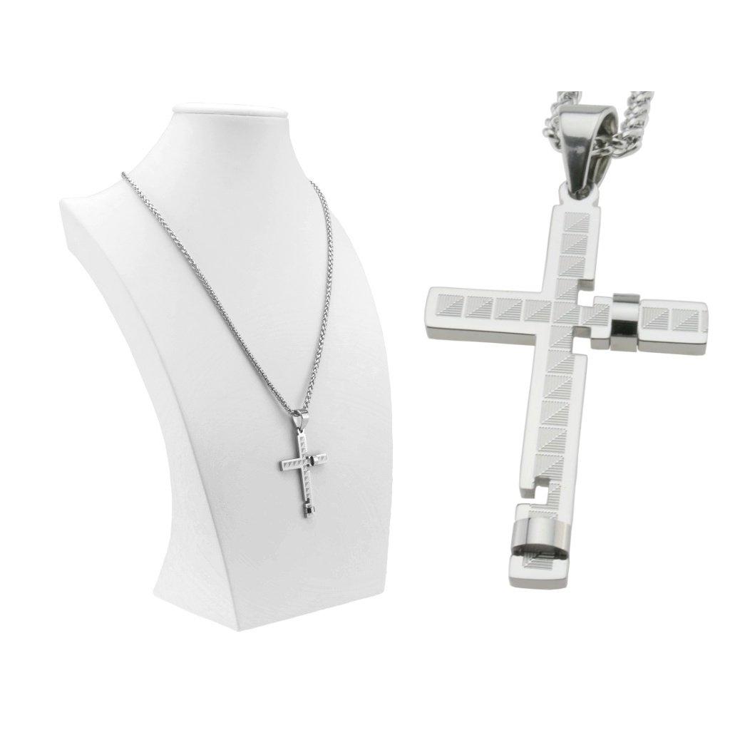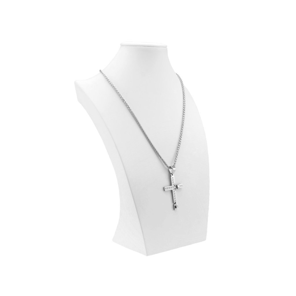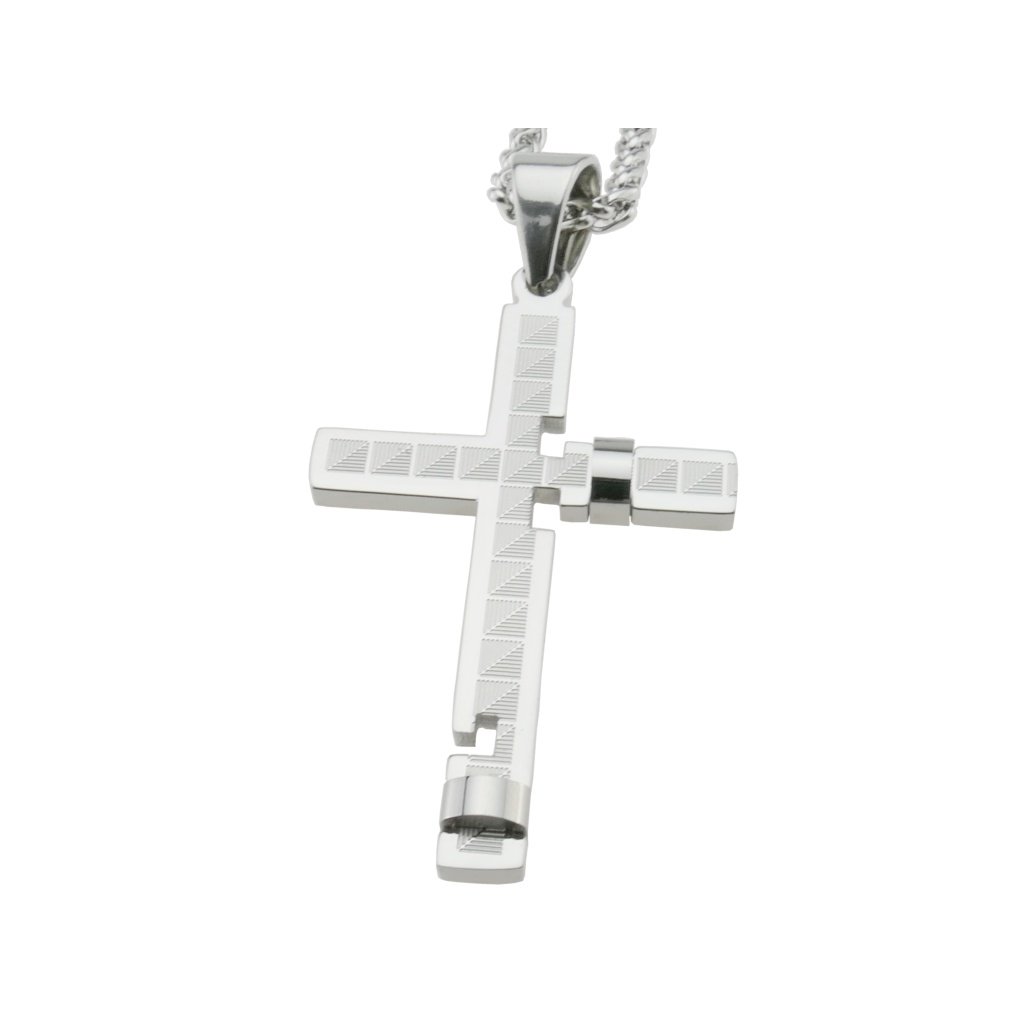 Elegantná retiazka striebornej farby s príveskom kríž z chirurgickej ocele. Prívesok kríža je v modernom štýle s jemným štvorčekovým vzorom a výrezmi v strede a dole s ozdobným pol kruhom. Kríž ako kresťanský symbol je veľmi obľúbeným motívom príveskov. Celý šperk je vyrobený z kvalitnej chirurgickej ocele, ktorá nečerná a nekoroduje a je vhodná aj na bežné každodenne nosenie, nevyžaduje si žiadnu špeciálnu starostlivosť. Pri tomto produkte si viete vybrať dĺžku retiazky ak Vám nevyhovuje jej základná dĺžka.