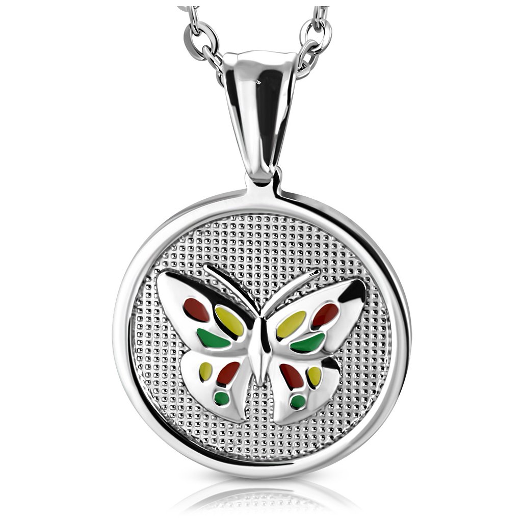 Retiazka s príveskom z chirurgickej ocele v tvare kruhu. V strede prívesku je motýľ s farebnými krídlami. Farebná kombinácia krídel je zelená s modrou a s ružovou. Chirurgická oceľ, z ktorej je prívesok vyrobený, zaručuje jeho dlhú životnosť. Základná dĺžka retiazky je 45 cm, avšak viete si vybrať vhodný variant dĺžky retiazky podľa Vašich potrieb. Tvar kruhového prívesku dotvára motýľ s farebnými krídlami umiestnený v jeho strede. Takýto prívesok sa veľmi ľahko skombinuje s každodenným pracovným alebo voľnočasovým outfitom. Jeho jedinečný dizajn ocenia všetky vekové kategórie.