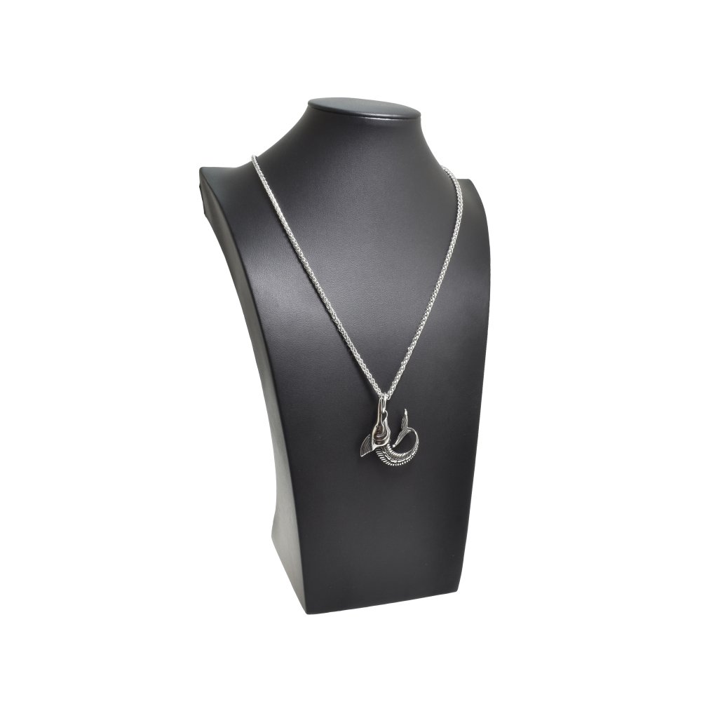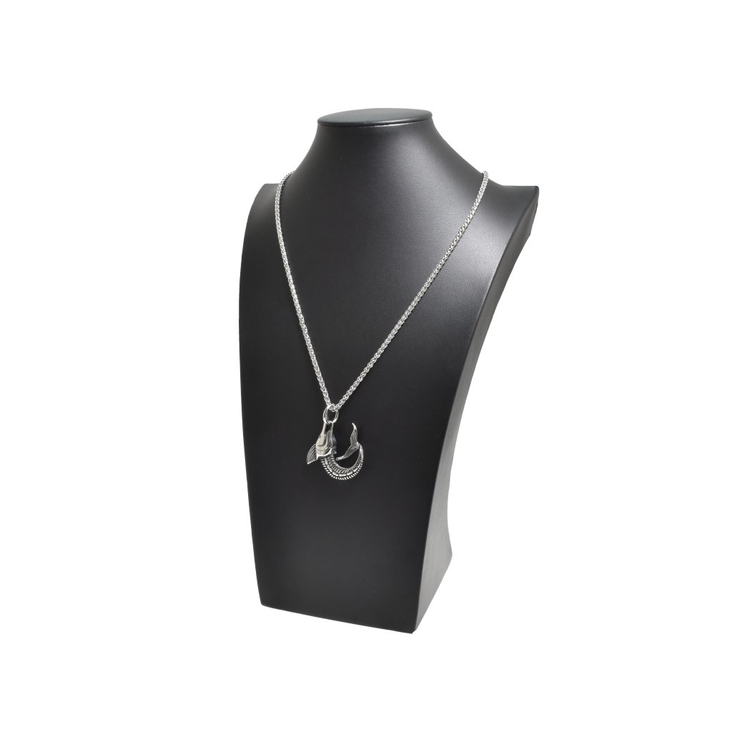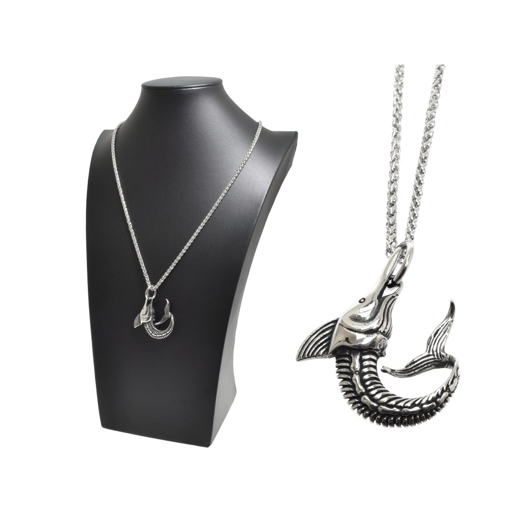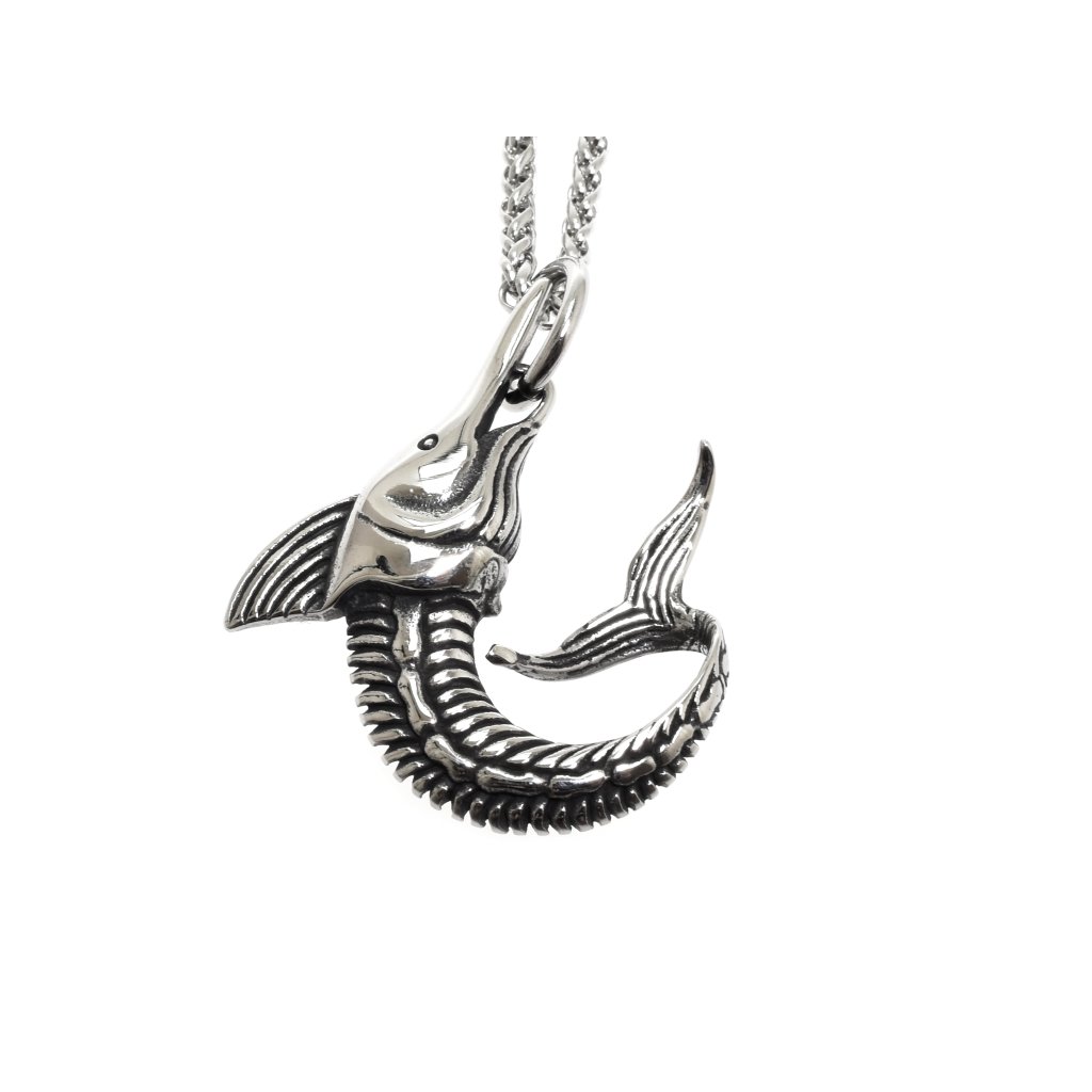 Retiazka s príveskom v striebornom prevedení z chirurgickej ocele. Prívesok v tvare ryby Mečúňa je väčších rozmerov. Chvost Mečúna je zahnutý a zdobený tmavou patinou rovnakou ako výrezky na jeho tele. Je to veľmi zaujímavý módny doplnok vhodný pre dámy aj pánov, ktorí majú radi výstredný štýl. Dá sa dobre skombinovať aj s inými doplnkami striebornej farby. Retiazka aj prívesok sú vyrobené z chirurgickej ocele, ktorá je odolná, nečerná a nekoroduje. Je antialergická, a preto je vhodná aj na bežné každodenne nosenie. Pri tomto produkte máte možnosť si zvoliť dĺžku retiazky podľa vlastnej potreby.