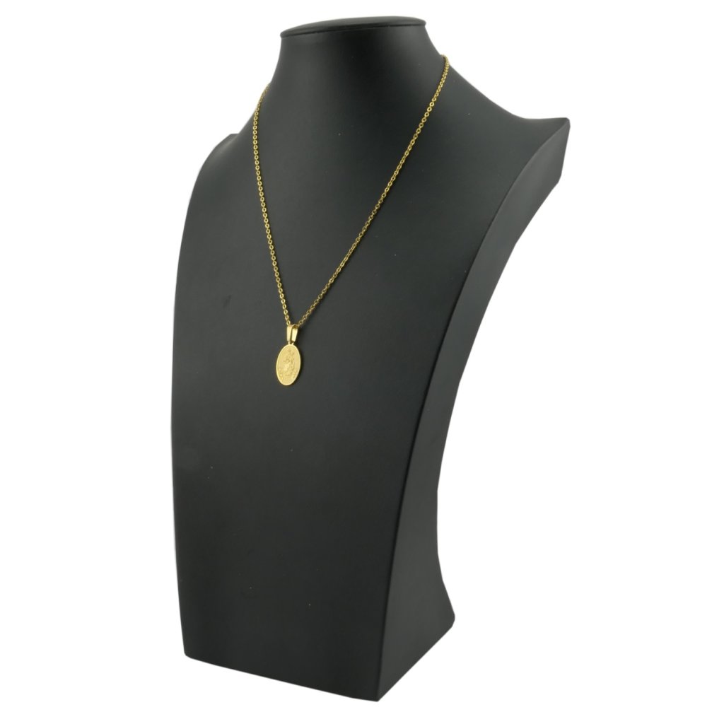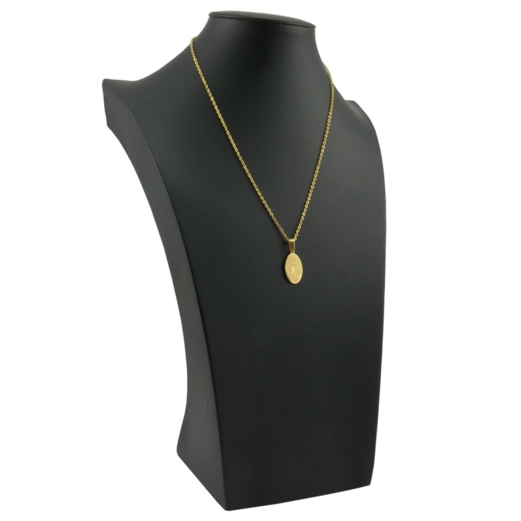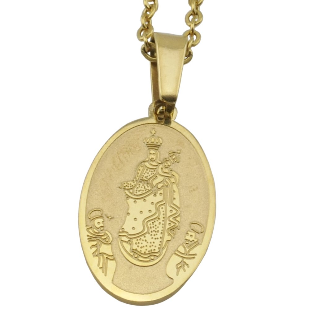 Krásny prívesok medajlón s motívom Panny Márie z chirurgickej ocele v zlatom prevedení. Šperk pôsobí veľmi decentne a jemne, preto je skôr vhodný pre dámy. Na matnom pozadí je vyobrazená Panna Mária s Ježišom Kristom na rukách. Šperk má veľmi náboženský charakter. Prívesok je vhodný aj ako darček k pamiatke na cirkevnú udalosť v živote človeka, ale rovnako je vhodný aj ako ochranca pre dospelého. Materiál retiazky a prívesku je kvalitná chirurgická oceľ, ktorá je pevná a odolná. Jej výhodou je hypoalergénnosť, vďaka čomu ju môžete nosiť každý deň bez obáv alergickej reakcie.
