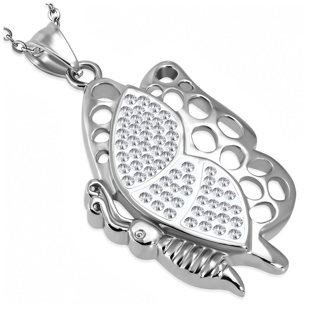 Retiazka z chirurgickej ocele s príveskom motýľa vykladaného na krídlách trblietajúcimi kryštálmi čírej farby. Prívesok je celý z chirurgickej ocele. Materiál, z ktorého sú retiazka a prívesok vyrobené, zaručujú ich dlhú životnosť. Základná dĺžka retiazky je 45 cm. Podľa Vašich individuálnych potrieb si viete vybrať vhodnú dĺžku retiazky. Prívesok je v tvare motýľa, ktorého krídla sú vykladané malými čírymi kryštálmi. Tie vytvárajú luxusný efekt. Je veľmi ľahko kombinovateľný k akýmkoľvek outfitom.