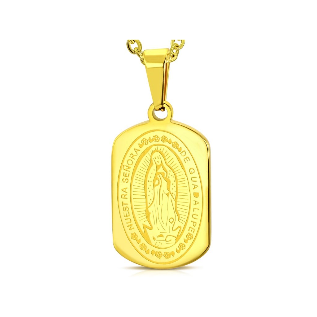 Krásny a elegantný prívesok platnička s motívom Panny Márie z chirurgickej ocele v zlatej farbe. Šperk pôsobí veľmi decentne a jemne, preto je skôr vhodný pre dámy. Prívesok môžete podarovať aj ako darček k pamiatke na cirkevnú udalosť v živote človeka, ale rovnako je vhodný aj ako ochranca pre dospelého. Materiál retiazky a prívesku je kvalitná chirurgická oceľ, ktorá je pevná a odolná. Jej výhodou je hypoalergénnosť, vďaka čomu ju môžete nosiť každý deň bez obáv alergickej reakcie. Pri tomto šperku máte možnosť si vybrať vlastnú dĺžku retiazky ak Vám nevyhovuje jej základná dĺžka.