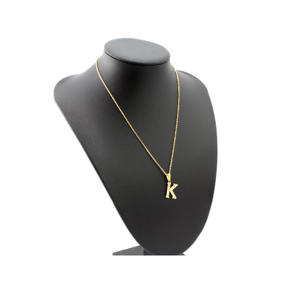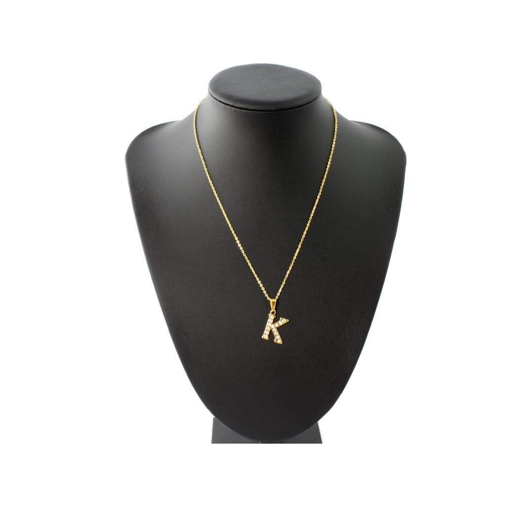 Vlastnosti a opis: Retiazka s príveskom z chirurgickej ocele písmeno "K " v zlatej farbe vykladané s očkami z kubického zirkónu