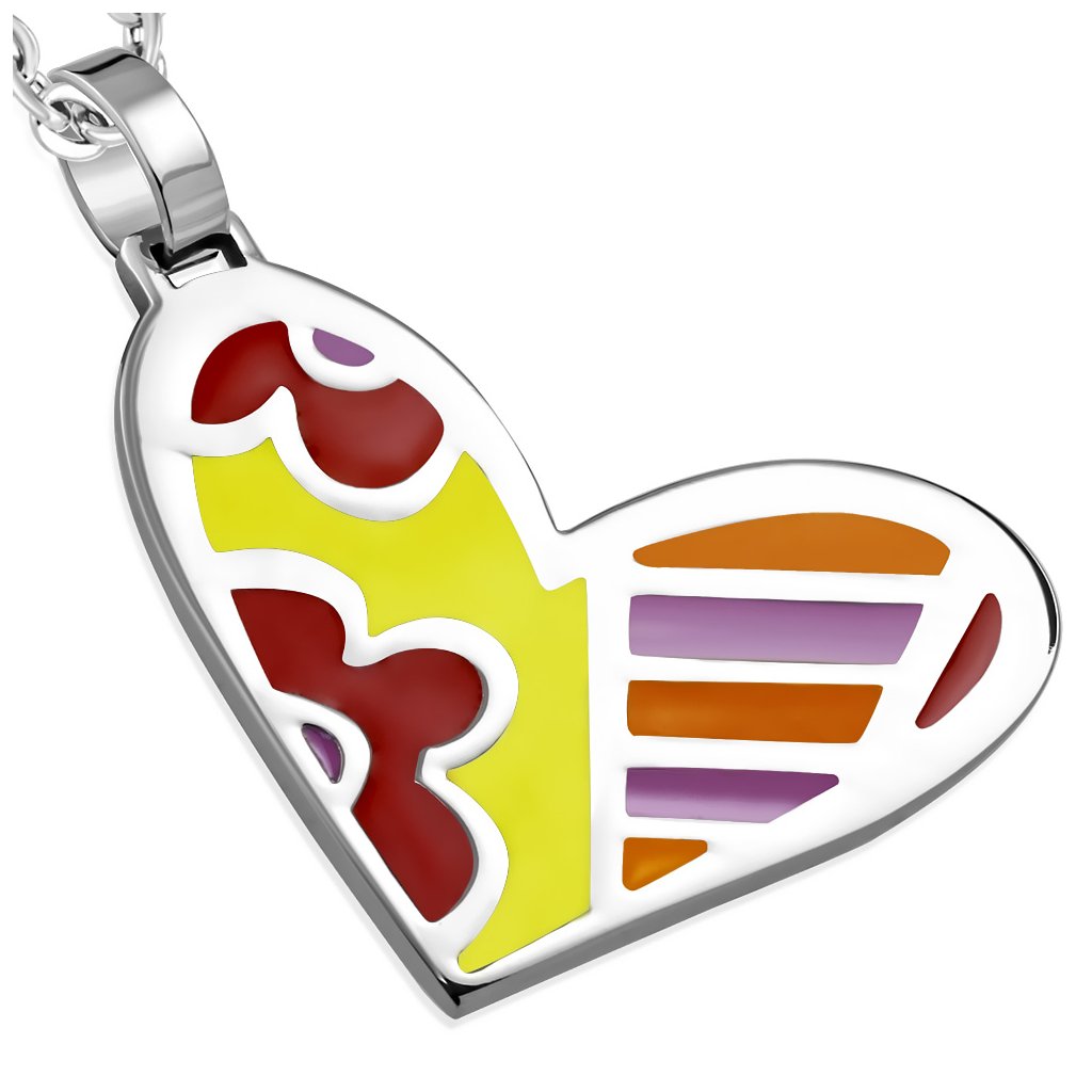 Retiazka s príveskom z chirurgickej ocele v tvare farebného veľkého srdiečka.Vyfarbený smaltovými farbami, ktoré zaručujú trvácnosť a lesk. Chirurgická oceľ, z ktorej je prívesok, zaručuje dlhú životnosť. Základná dĺžka retiazky je 55 cm. Podľa Vašich individuálnych predstáv si viete vybrať vhodnú dĺžku retiazky. Tvar srdiečka je vyfarbený smaltovými farbami, ktorých prednosť je trvácnosť a lesk. Dizajn srdiečka je veľmi orginálny - na jednej strane srdiečka sú nakreslené kvety a na druhej strane pásiky. Spolu vytvárajú komplexný tvar srdiečka. Vhodný je pre všetky vekové kategórie.