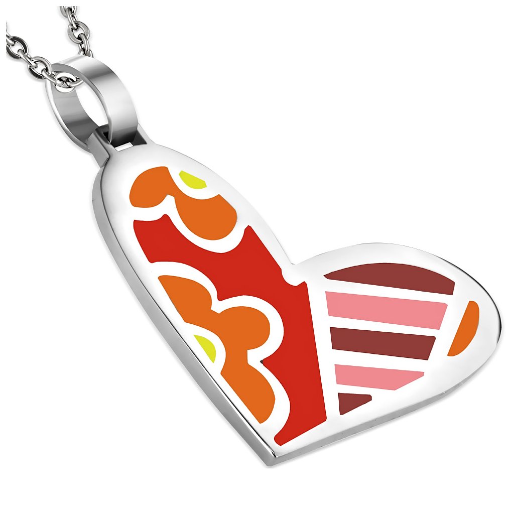 Retiazka s príveskom z chirurgickej ocele v tvare farebného veľkého srdiečka. Vyfarbený smaltovými farbami , ktoré zaručujú trvácnosť a lesk. Chirurgická oceľ, z ktorej je prívesok vyrobený, zaručuje jeho dlhú životnosť. Farby, ktoré sú na prívesku použité, garantujú trvácnosť a dlhotrvajúci lesk. Na srdiečku sú použité kreatívne kresby pásikov na jednej strane a na druhej strane sú nakreslené kvety. Smaltové farby použité na prívesku zaručujú jeho jednoduchú kombinovateľnosť s akýmkoľvek outfitou. Vhodný je pre všetky vekové kategórie. Pri tomto produkte máte možnosť si zvoliť dĺžku retiazky podľa vlastnej potreby.