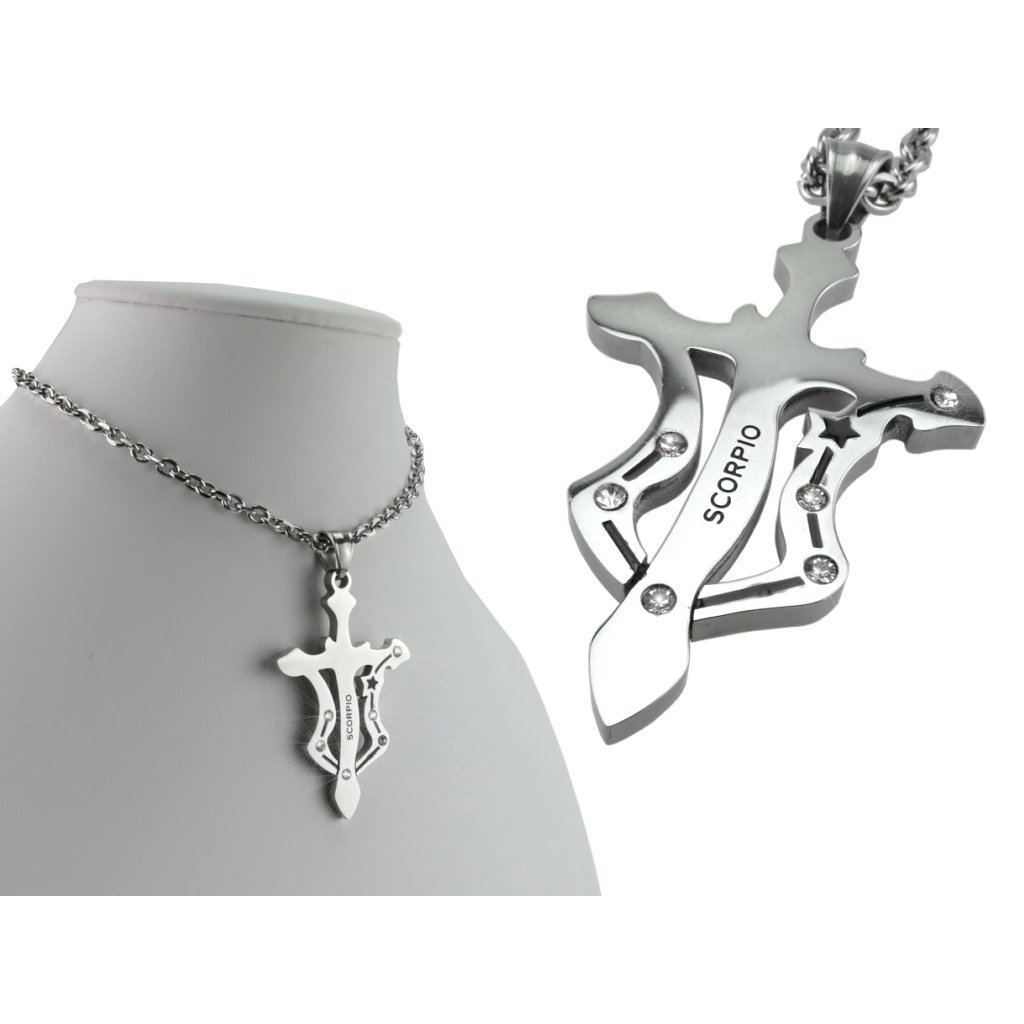 Retiazka s krásnym príveskom znamenie zverokruhu Škorpión z chirurgickej ocele. Prívesok má netradičný tvar súhvezdia znamenia Škorpión, preto je vhodný pre ľudí narodených od 23.10. do 22.11. Škorpión patrí medzi vášnivé znamenia, no zároveň tajomné. Ich sila spočíva v podmanivom a nepreniknuteľnom charaktere. Prívesok je zdobený malými očkami a čiernou hviezdou. Dole ma nápis Scorpio, čo znamená škorpión.Šperk pôsobí netradične no veľmi štýlovo a moderne. Je vyrobený z chirurgickej ocele, ktorá nepotrebuje špeciálnu starostlivosť, je vhodná na každodenne nosenie, nekoroduje, nečerná a je antialergická. Pri tomto šperku si viete zvoliť vami požadovanú dĺžku retiazky.