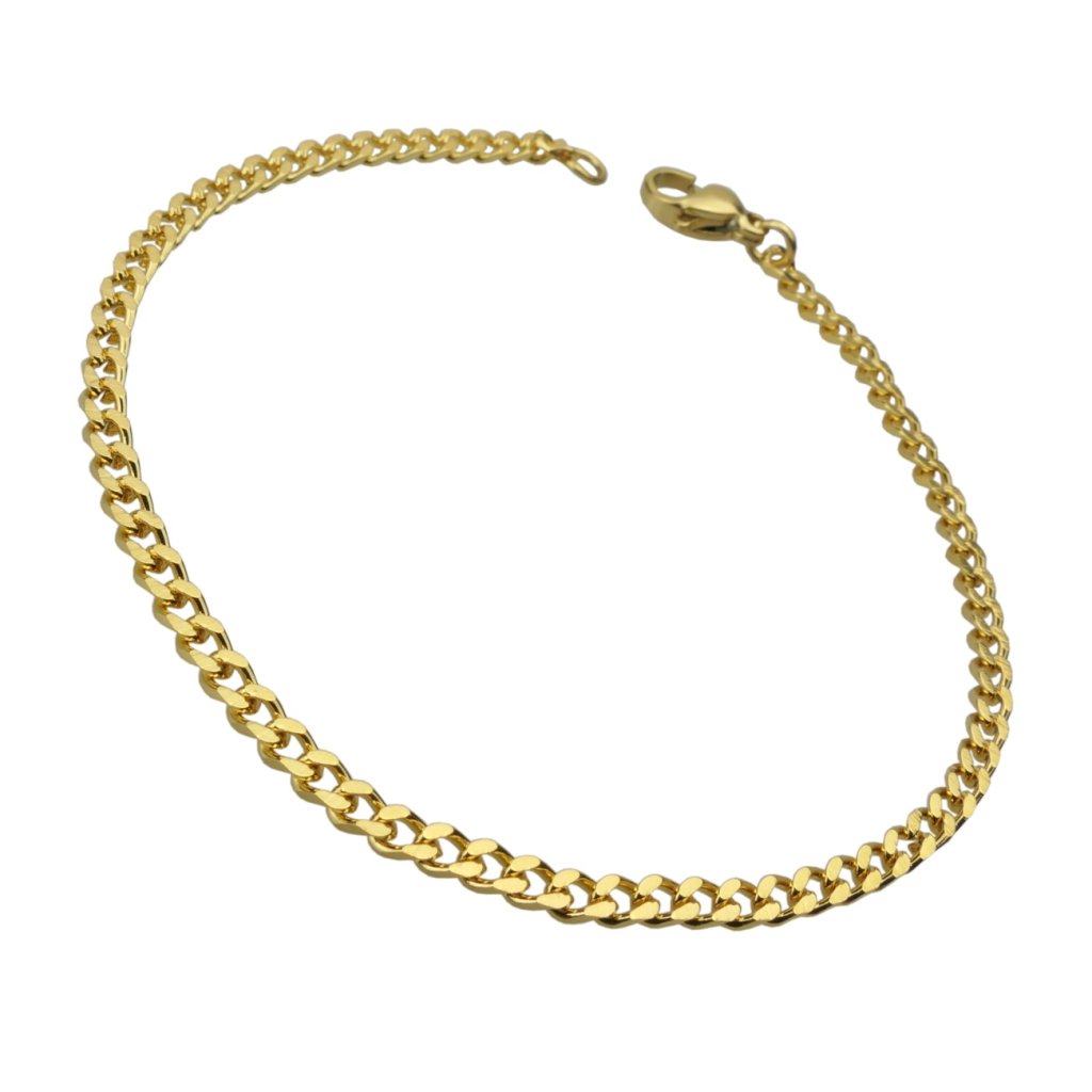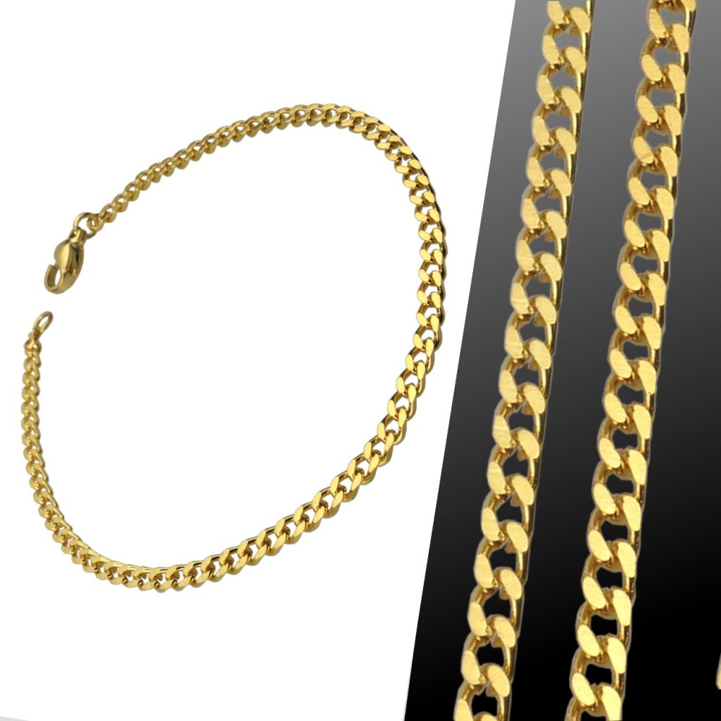 Krásny jednoduchý retiazkový náramok vhodný pre obe pohlavia. Náramok je plochý z brúsenými očkami čo dodáva lesk náramku. Celý náramok je vyrobený z kvalitnej chirurgickej ocele s pozlátenou povrchovou úpravou. Chirurgická oceľ je hypoalergénna a náramok je vhodný pre všetky vekové skupiny.