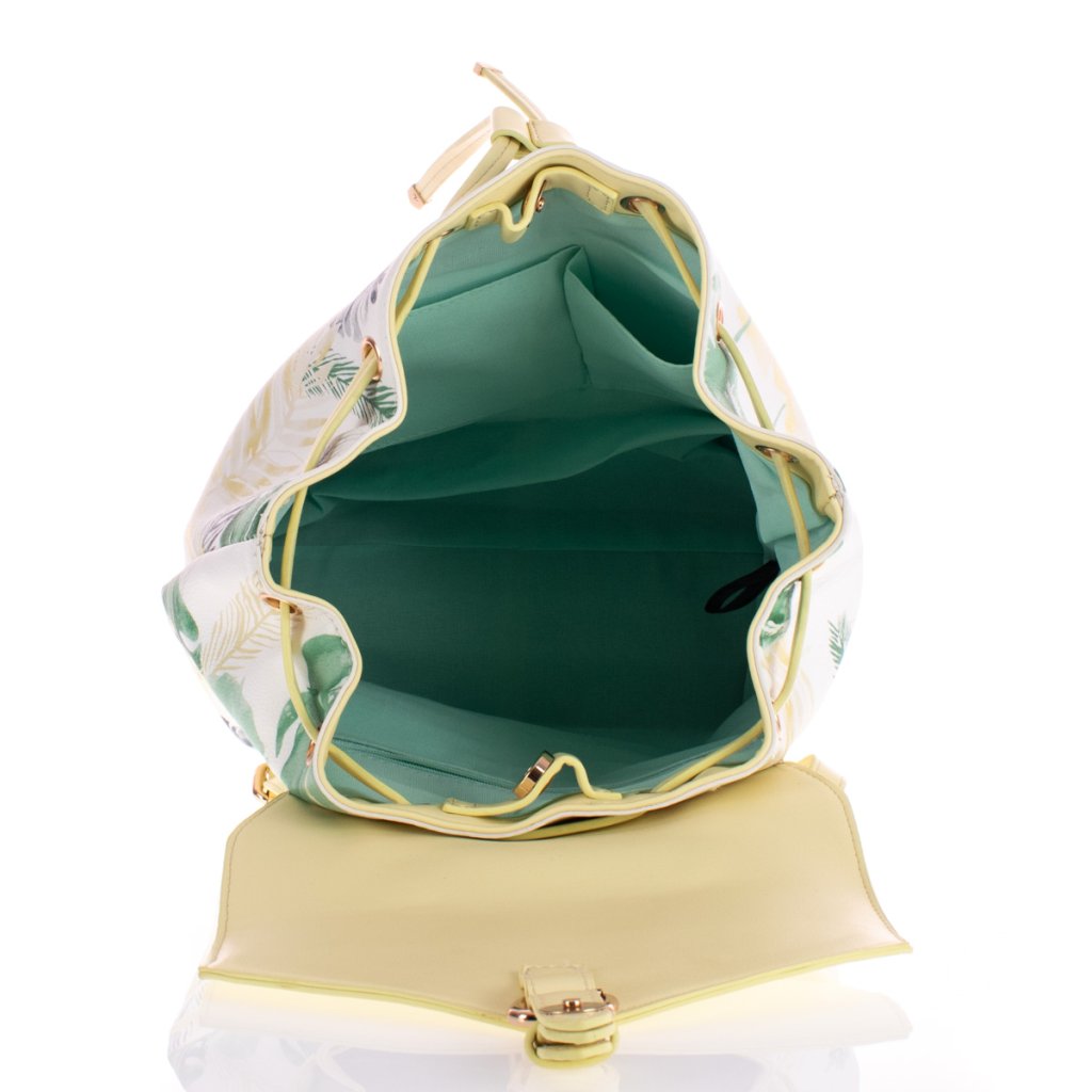 Batoh od značky DianaCo je vyrobený z hladkej syntetickej kože s kvetinovou potlačou. Jeho vnútro je priestranné, vhodné pre stredne veľké predmety. Uzatvára sa cvokom zvnútra, sťahovacou šnúrkou a cvokom zvonka. Pohodlne sa nosí popruhmi na ramenách. Jednoduchosť, veselosť a elegancia, to všetko v jednom ruksaku.