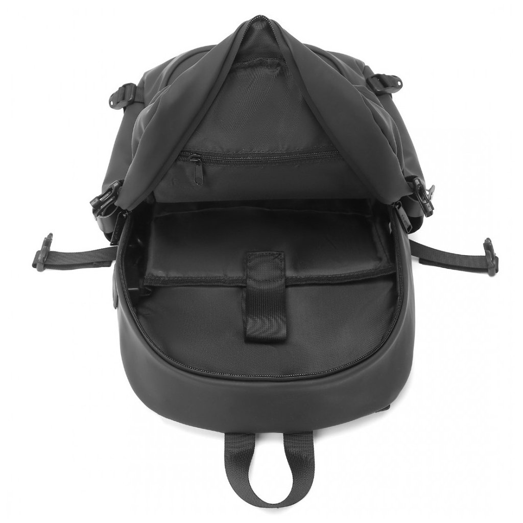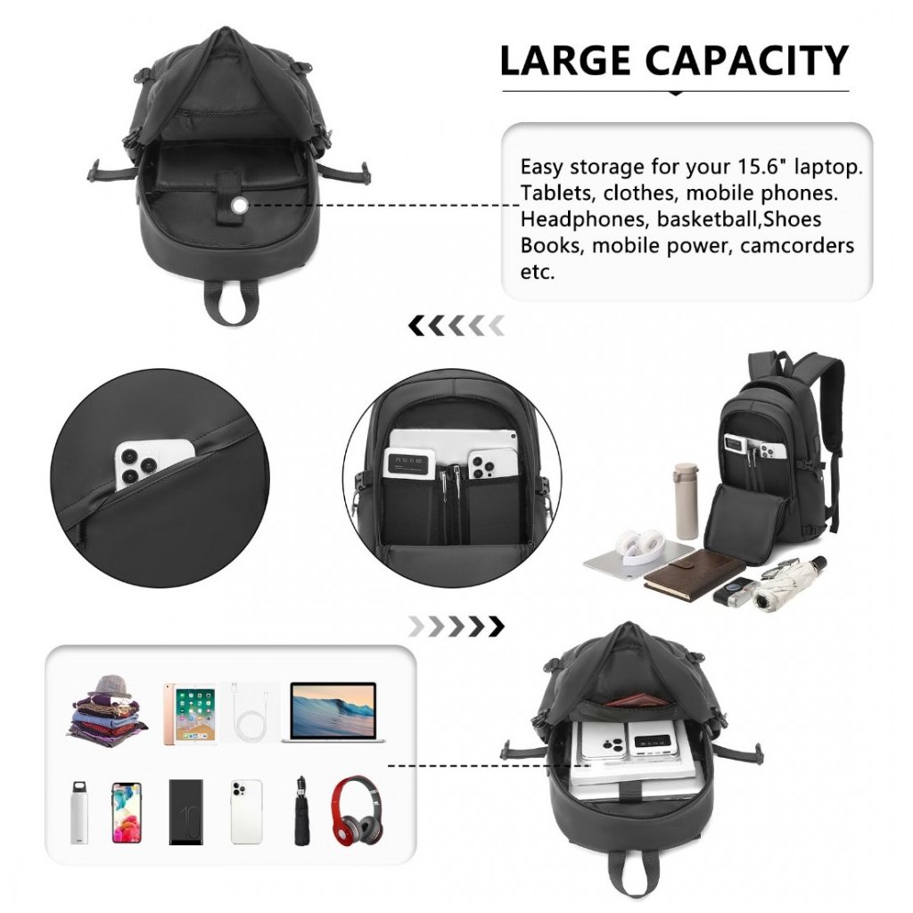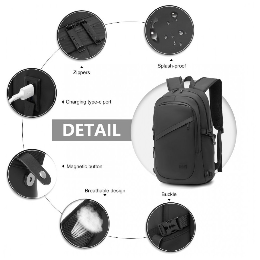 Tento čierny batoh vyrobený z pevnej tkaniny s PVC povrchom ponúka nielen elegantný dizajn, ale aj praktickú funkčnosť, ktorá zaručuje odolnosť voči vode a ochranu vašich vecí. Poskytuje dostatok miesta na notebook, elektroniku a ďalšie vybavenie, pričom vďaka špeciálnym priehradkám s možnosťou fixácie zabezpečuje ich bezpečné uloženie. Jednou z hlavných výhod tohto batohu je USB pripojenie pre externú batériu, ktoré umožňuje nabíjanie vašich zariadení na cestách, a to bez kompromisov v pohodlí. Vystužené nastaviteľné popruhy cez ramená zaručujú komfort aj pri dlhšom nosení.