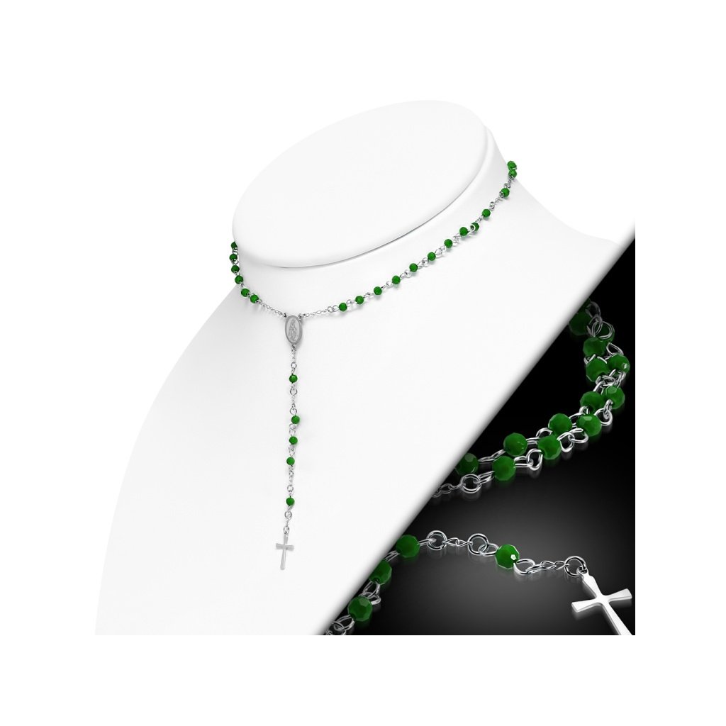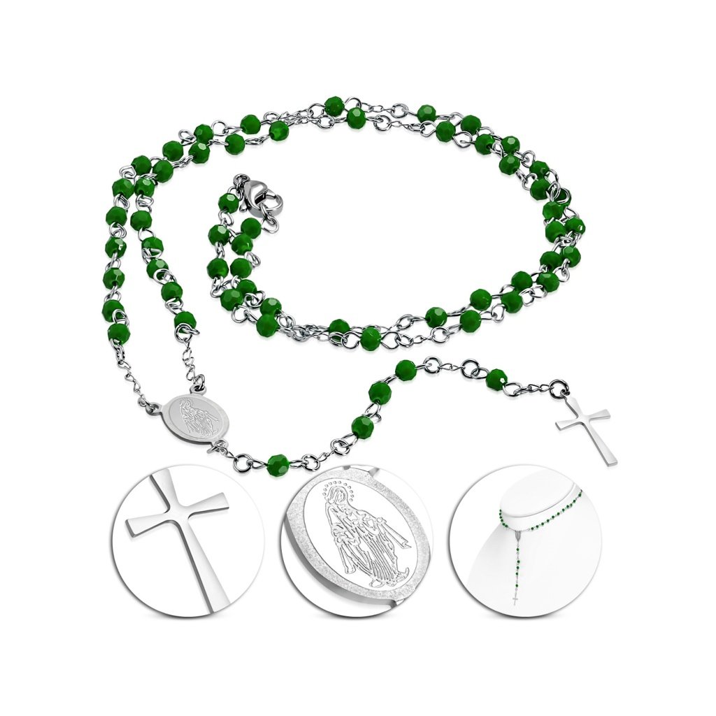 Ruženec zelený vyrobený z chirurgickej ocele. Guličky ruženca sú zelenej farby a sú vyrobené z akrylu vo veľkosti 3 mm. Šperk je zdobený v strede malou platničkou, na ktorej je zobrazená Panna Mária a taktiež menším krížom. Ruženec je skvelým darčekom na prvé sväté prijímanie, birmovku či iné cirkevné slávnosti, pretože má istú náboženskú hodnotu. Ruženec má zapínanie na klasickú karabínku, čo uľahčuje jeho nosenie. Vyrobený je z kvalitnej chirurgickej ocele. Oceľové šperky sa v súčasnosti tešia čoraz väčšej obľube aj z dôvodu, že je to veľmi odolný, tvrdý a stály materiál, ktorý zaručuje, že šperky ostávajú stále rovnako krásne aj po dlhom nosení.