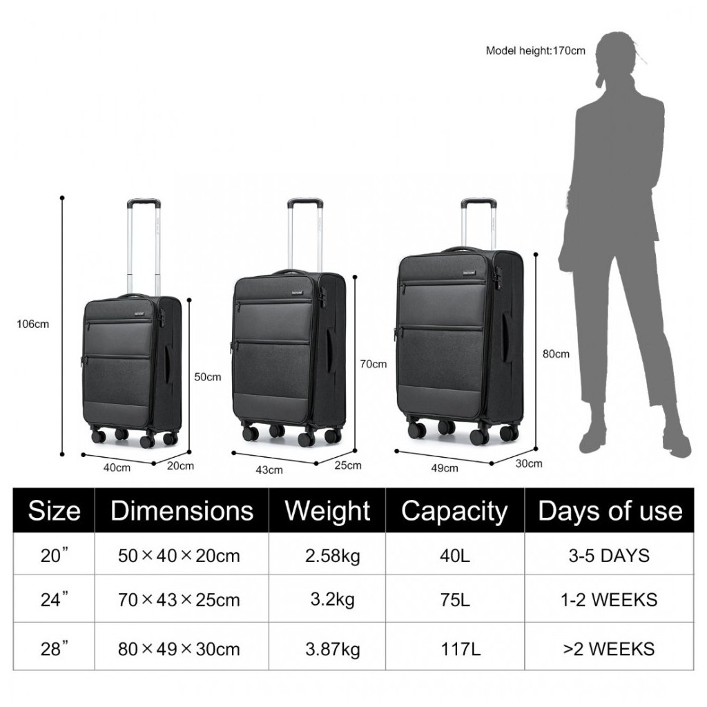 - Veľký kufor (117L): 80 x 49 x 30 cm, váha 3,87 kg – perfektný na dlhšie cesty.
