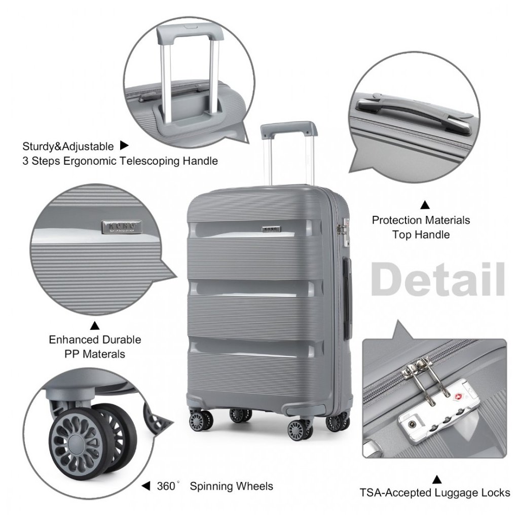 Kufre sú z pevného PP plastového materiálu, ktorý je pevný a odolný voči nárazom a poškodeniu. S batožinou sa narába prakticky a ľahko vďaka teleskopickej hliníkovej rúčke do 104 cm a 360 - stupňovým kolieskam. O bezpečnosť vašej batožiny sa naozaj nemusíte báť, nakoľko kufre disponujú so špeciálnym zámkom na kód. Vystužené vnútro je dokonale prispôsobené pre vašu batožinu, ktorú zaistíte gumovými páskami. Kozmetické drobnosti či iné technologické vecičky možno vložiť do zipsového priečinku.