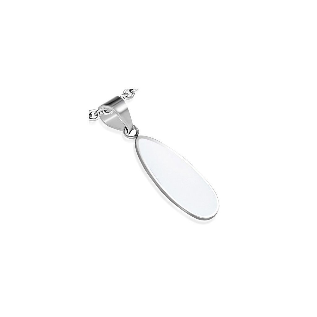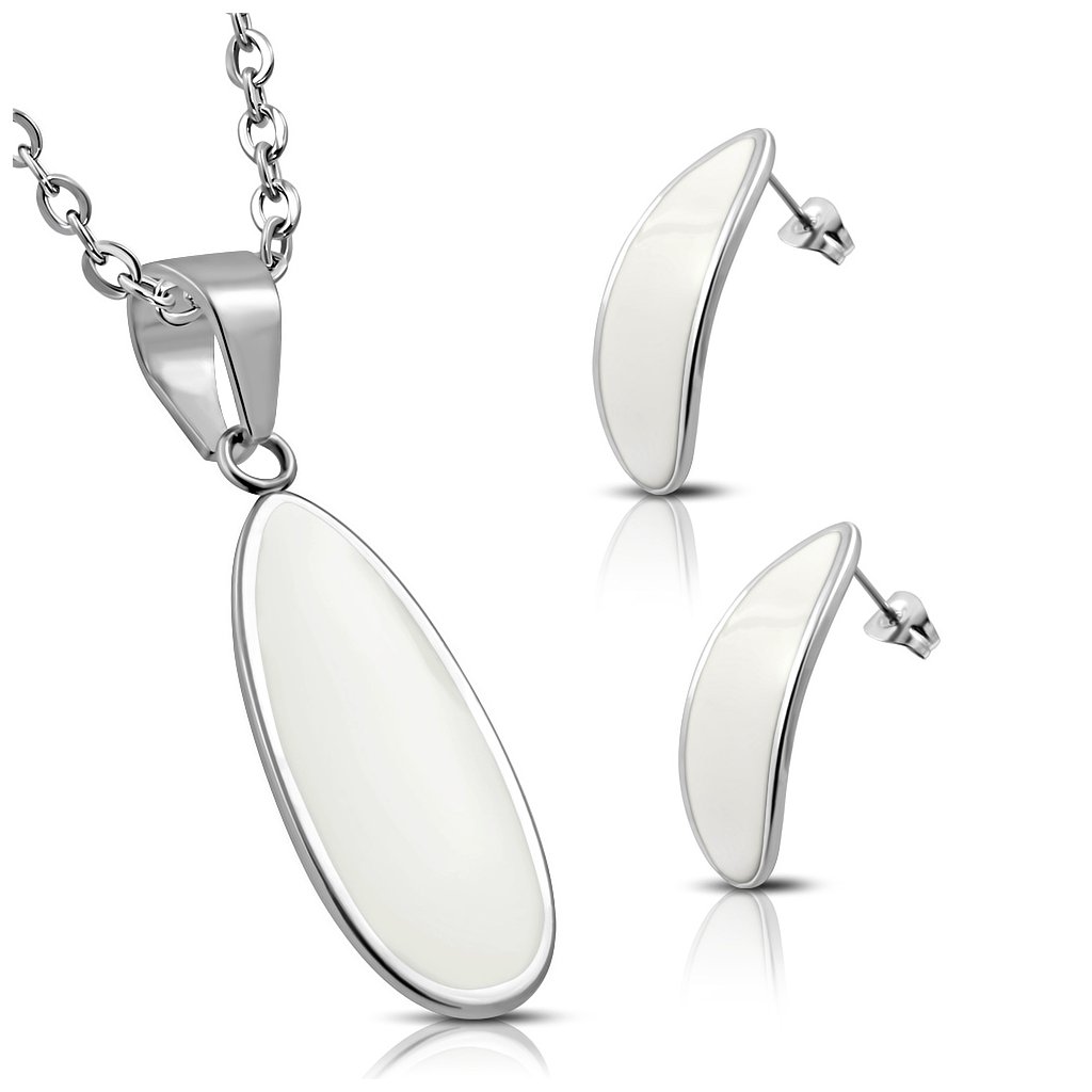 Set retiazky s príveskom a náušníc z chirurgickej ocele v bielej farby v tvare oválu. Materiál, z ktorého je set vyrobený, zaručuje jeho dlhú životnosť. Základná dĺžka retiazky je 45 cm. Podľa Vašich individuálny potrieb si však viete zvoliť z viacerých variantov dĺžok. Dizajn prívesku a náušníc je v tvare veľmi módneho oválu. Biela farba setu náušníc a prívesku z chirurgickej ocele zaručuje jeho ľahkú kombinovateľnosť s rôznymi outfitmi. Klasický tvar setu náušníc a prívesku dovedie do dokonalosti aj akýkoľvek spoločenský outfit.