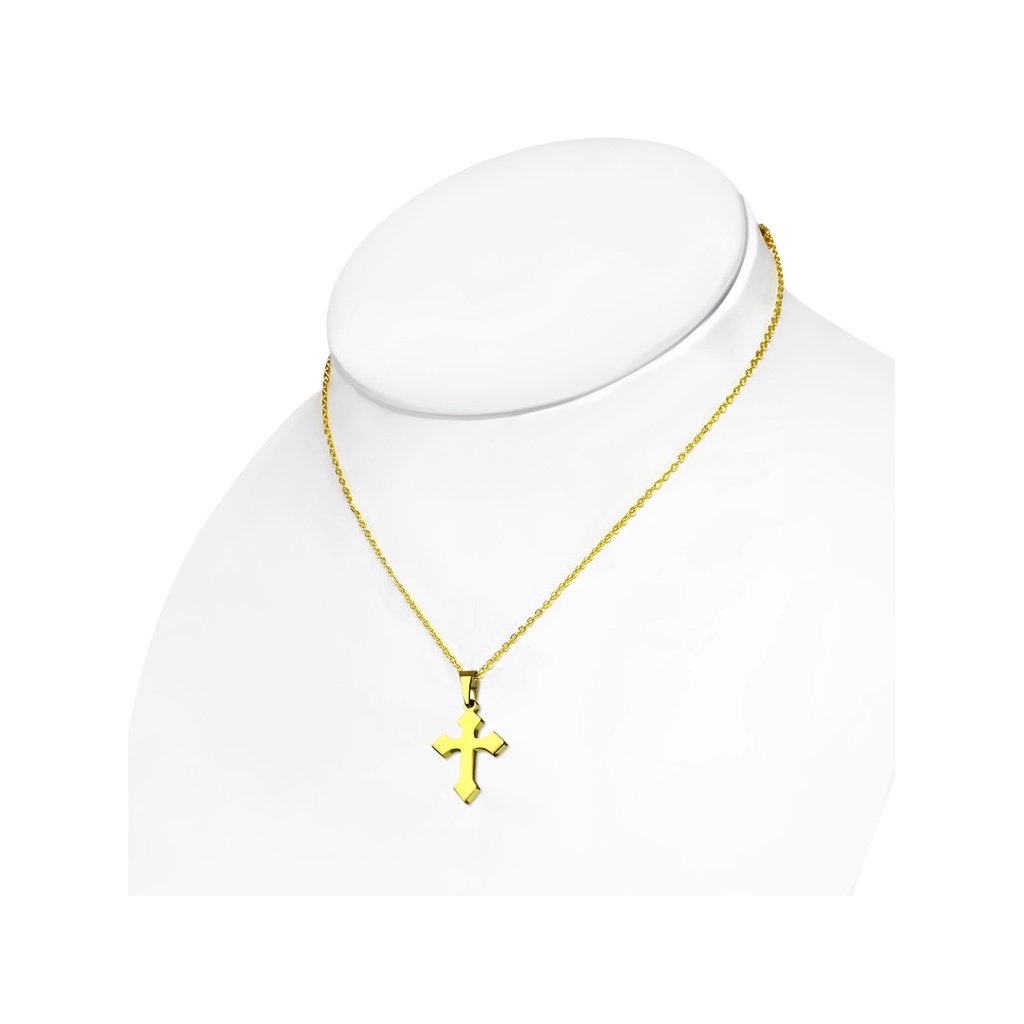 Nádherný set z chirurgickej ocele v zlatom prevedení. Prívesok aj náušnice sú v tvare kríža, ktorý ma ozdobné zakončenia. Celý set pôsobí decentne a jemne, sú skvelým doplnkom, alebo aj darčekom pre dámy a pánov, ktorí majú radi náboženský štýl šperkov. Materiál, z ktorého je celý set vyrobený je kvalitná chirurgická oceľ. Tá je veľmi pevná a odolná. Medzi jej hlavné výhody patrí to, že je antialergická a nepotrebuje žiadnu špeciálnu starostlivosť.