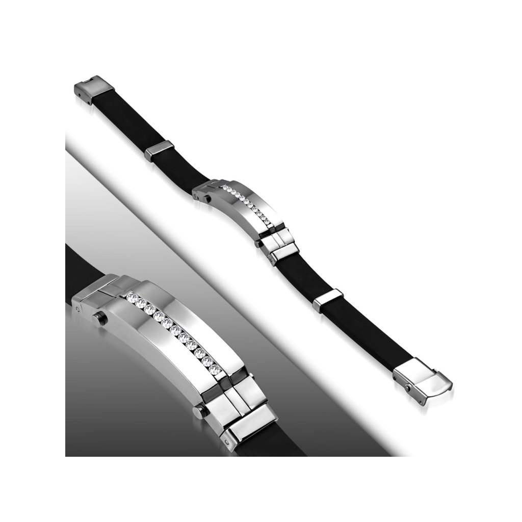 Unisex silikónový náramok v kombinácií s chirurgickou oceľou. Náramok je vyrobený z čiernej silikónovej gumy. Ozdoba je vyrobená z kvalitnej chirurgickej ocele a zdobená malými očkami čírej farby. Náramok pôsobí mohutnejšie preto je vhodný pre pánov, zároveň aj pre dámy vďaka čírym očkám, ktoré preferujú výraznejšie šperky. Z chirurgickej ocele je vyrobené aj zapínanie náramku hodinkového typu. Oceľ je pevný a odolný materiál, ktorý nečerná a nekoroduje. Náramok je vhodný na bežné každodenné nosenie.