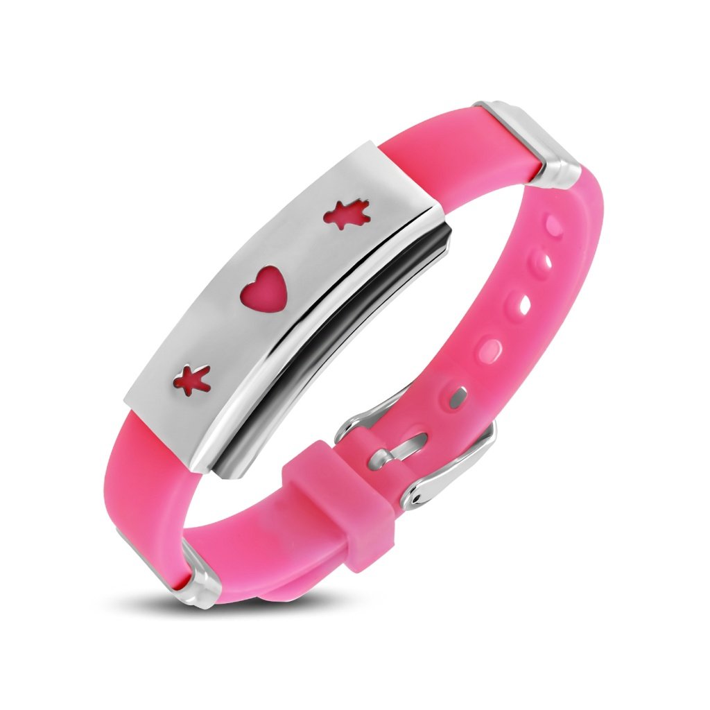 Dámsky silikónový náramok v kombinácií s chirurgickou oceľou. Materiál náramku je silikónová guma krásnej jasnej ružovej farby. Náramok má ozdobu z chirurgickej ocele, na ktorej je znázornené srdiečko a dve malé postavičky. Je vhodný aj ako šperk pre deti, nielen kvôli motívu, ale aj vďaka svojmu klasickému hodinkovému zapínaniu, pretože sadne aj tej najmenšej detskej rúčke. Materiál zapínania náramku a ozdoby je kvalitná chirurgická oceľ, ktorá je pevná a odolná. Nekoroduje a nečerná a je vhodná na bežné každodenné nosenie.