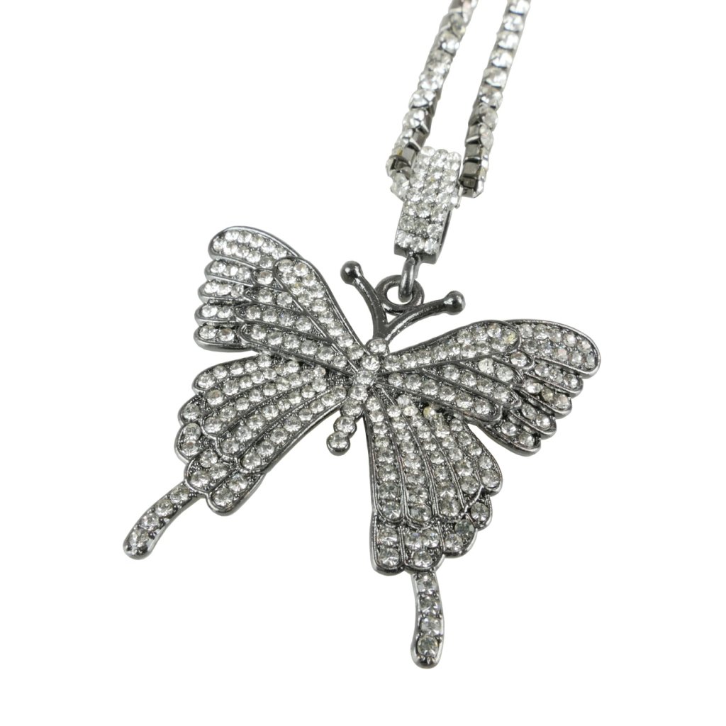 Krásny dámsky šperk retiazka s príveskom v tvare motýľa v tmavom prevedení. Náhrdelník ja vhodní na slávnostné príležitosti a samozrejme sa dá doladiť aj k iným bežným outfitom. Náhrdelník je vyrobený z bižutérneho kovu a celý je zdobená čírymi očkami.